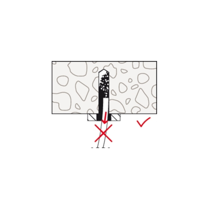- Bei vertikaler Montage (in Decken und Böden) und der Verwendung von Hohlbohrern ist eine Bohrlochreinigung nicht erforderlich. Bei Bohrungen in den Boden muss 3x Bohrdurchmesser tiefer gebohrt werden