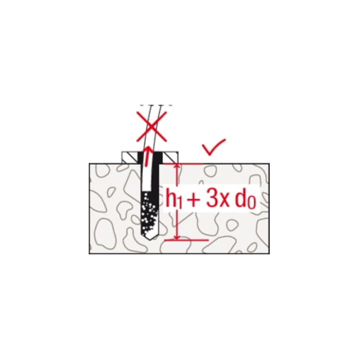 - Bei Montage in Decke und Boden oder unter Verwendung von Hohlbohrern ist eine Bohrlochreinigung nicht erforderlich. Bei Bohrungen im Boden muss 3x Bohrdurchmesser tiefer gebohrt werden