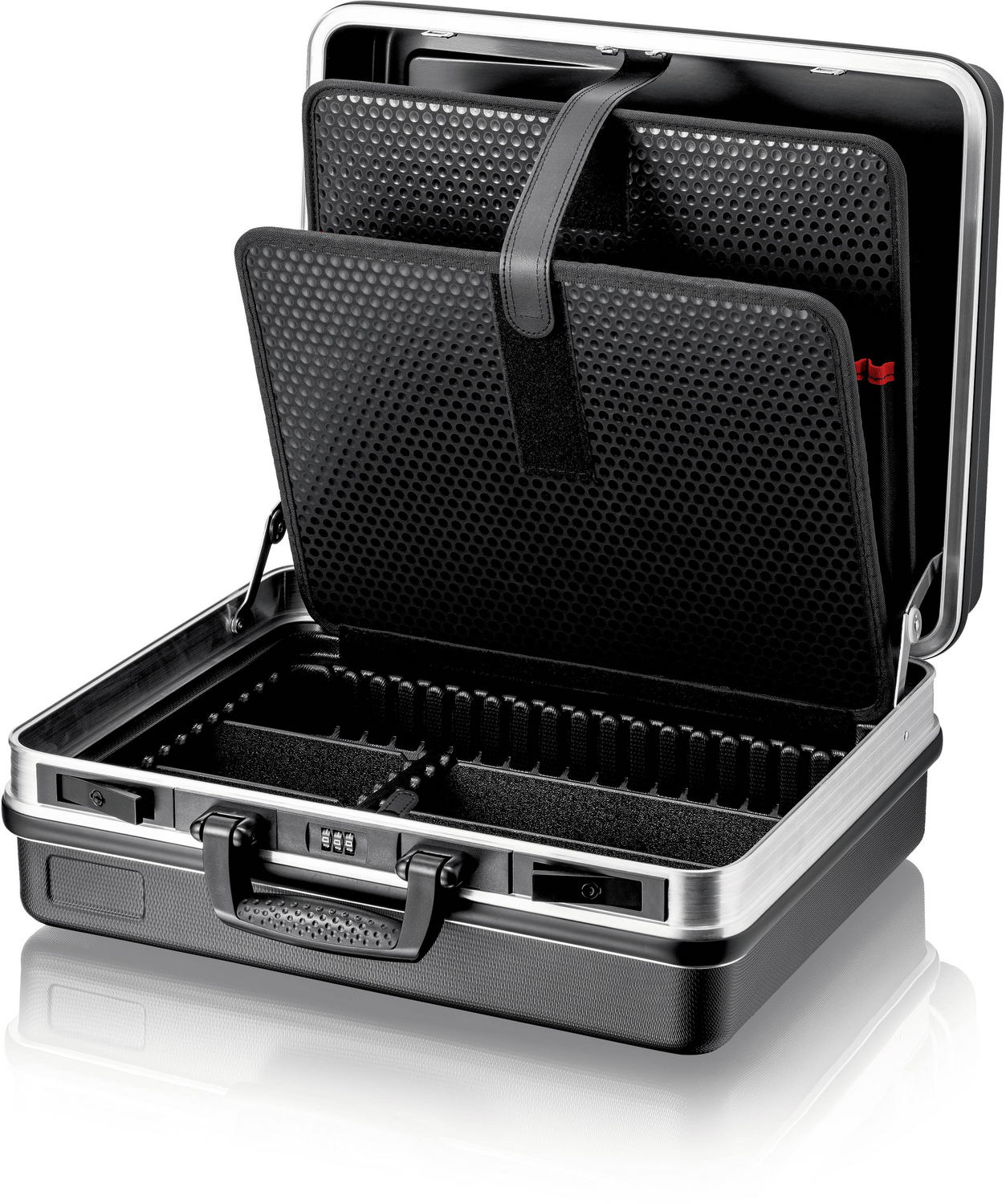 Beschreibung: Die hochwertige Verarbeitung dieses Werkzeugkoffers sieht man auf den ersten Blick: stabil, schlagfest und kratzfest ist das hochwertige ABS-Material der Kofferschalen. Die Metallscharniere führen den Deckel beim Öffnen und Schließen sicher, auch wenn er mit viel Werkzeug bestückt ist. Das 3-stellige Zahlenschloss dient dem Schutz vor unbefugtem Zugriff. Zwei solide Kippschlösser halten den Deckel geschlossen. Einmal geöffnet, wird der Deckel von einer Scharniermechanik gehalten. Mit Einsätzen kann die 50 mm hohe Bodenschale individuell so unterteilt werden, dass auch unterwegs eine Ordnung vorhanden ist, die dem persönlichen Arbeitsstil entspricht. Zwei herausnehmbare Werkzeugtafeln aus schmutzabweisenden PP-Hohlkammerplatten mit 21 bestückbaren Werkzeugtaschen bieten Zangen, Schraubendrehern und weiterem Werkzeug sicheren Halt und dem Anwender Übersicht. Die Bodenschale ist durch Einsätze weiter unterteilbar und die Abdecktafel mit zwölf großen Werkzeugtaschen und einem Flachfach per Druckknopf fixierbar. Beide Werkzeugtafeln lassen sich herausnehmen – ideal für den mobilen Einsatz und zur Aufbewahrung eines Werkzeugsortiments z.B. außerhalb der Werkstatt.