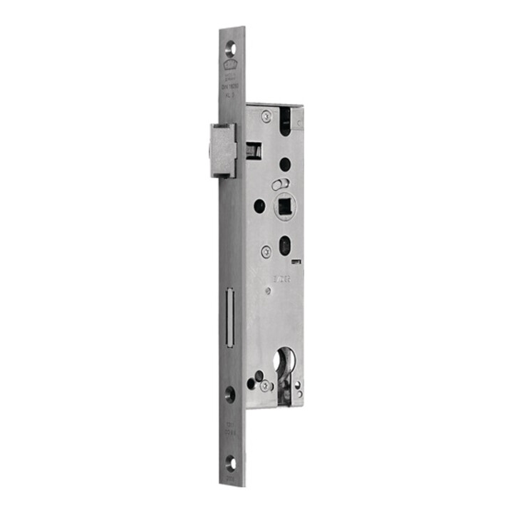 für einflügelige Türen · Stulp Oberfläche Edelstahl matt · zugelassen nach DIN 18251-2 Klasse 3 und EN 12209 für Feuerschutztüren · Falle aus Feinguss und Riegel aus Zink-Druckguss · 20 mm Riegelausschluss, 1-tourig · PZ · Entfernung 92 mm · 9 mm Vierkant Weitere technische Eigenschaften: · Stulpbreite: 24mm · Anschlagrichtung: DIN rechts · Stulpausführung: käntig · Lochung: PZ