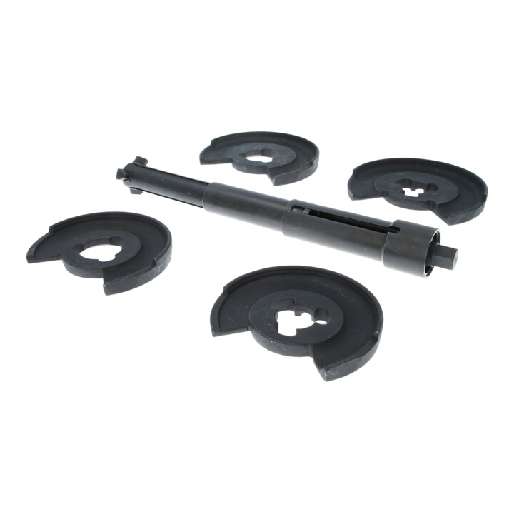 Mit dem BRILLIANT TOOLS Teleskop-Innenfederspanner BT651010 können Sie die Fahrwerksfedern ohne Zerlegung der Achse spannen (Ausnahmen möglich). Das mit einem Spindelüberlastungsschutz ausgerüstete Federspanngerät ist für den Betrieb mit einem Schlagschrauber ausgelegt. Durch die 3-Punkt-Arretierung ist ein Spannen der Federn nur möglich, wenn die Druckplatten richtig eingesetzt sind. Gleichzeitig wird ein Verdrehen der Druckplatten verhindert. Der Antrieb hat SW 24 mm. Für den Fall, dass der Überlastungsschutz eine Beschädigung an der Spindel verhindert hat, kann der Federspanner per Hand über einen SW 14 mm Hilfsantrieb wieder entlastet werden. Durch die Teleskopkonstruktion verändert sich beim Spannen die Länge des Innenfederspanners. Dadurch können Sie in vielen Fällen die Federn wechseln, ohne dass die Achse zerlegt werden muss. Zur Durchführung durch z.B. den Querlenker ist ein Lochdurchmesser von mindestens 45 mm erforderlich.