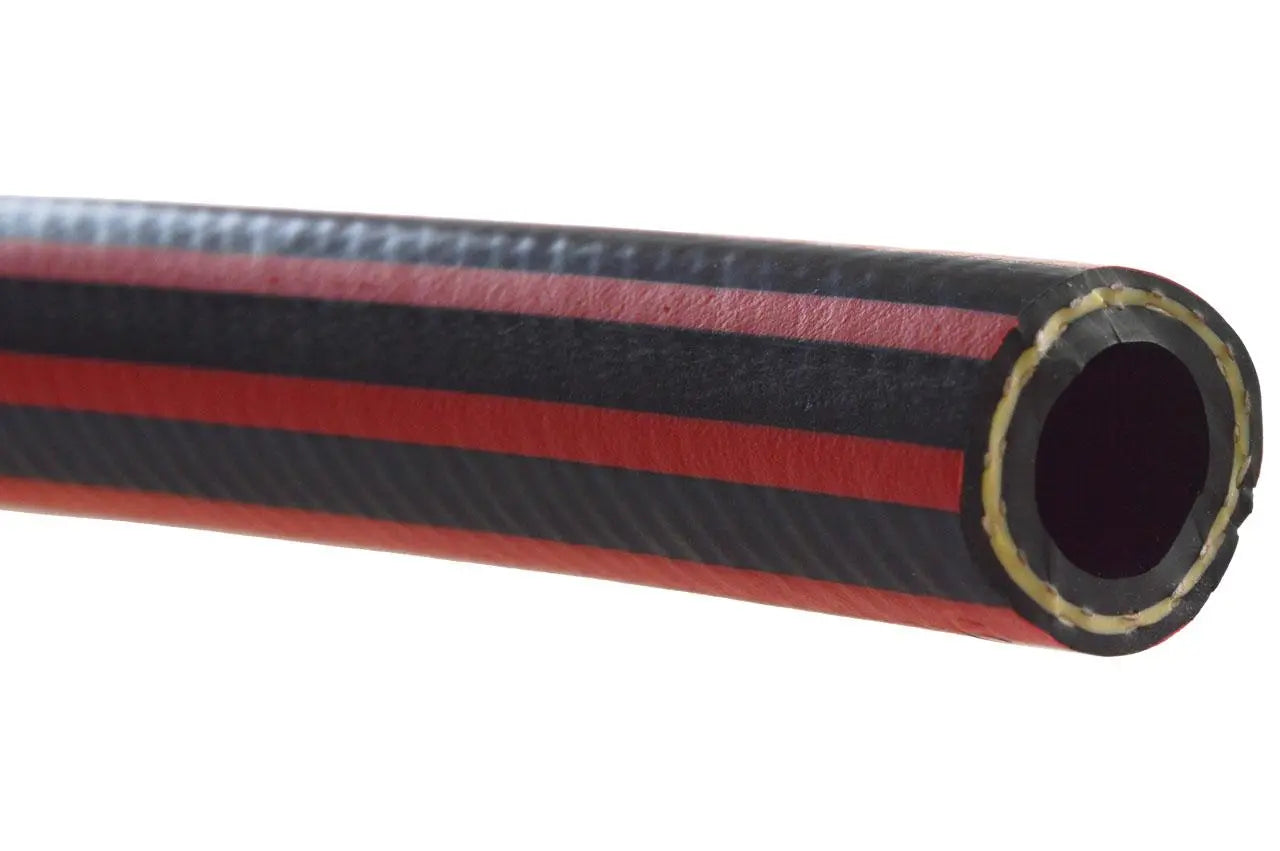 Schlauchdecke: EPDM, schwarz mit 6 roten, axial verlaufenen Streifen, glatt, ab DN 28 stoffgemustert, ozon-, witterungs- und UV-beständig