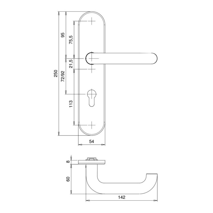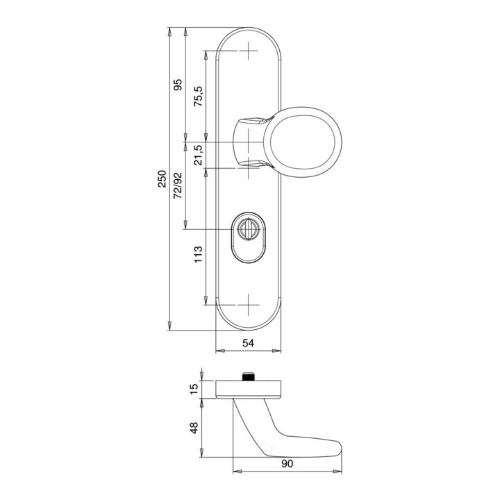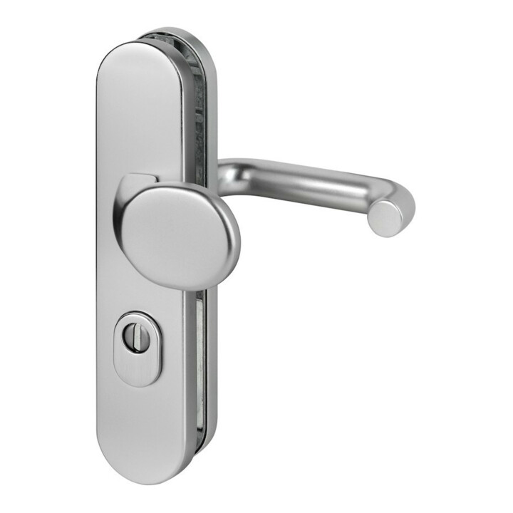 Grundkonstruktion: Druckguss mit 2 mm Teilstahleinlage im Außenschild, oberflächengehärtet. Stärke Innenschild = 8 mm. Drücker-Lagerung: lose. Drückertyp und -stärke: 103 mit Ø 22 mm, bzw. bei Alu 8 mm VKT = 104 mit Ø 18 mm. Knopfausführung bei Wechselgarnitur: Modell …/0272 und …/0292 = K2 (gekröpft), bzw. Modell …/0772 und …/0792 = K7 (gerade). Stütznocken: M6, Ø 10 mm anbohrgeschützt. Verschraubung: 3-fach M6, verdeckt. Anbohrschutz beim Außenschild. Wechselgarnituren mit Spezialrollenwechselstift mit M12-Gewinde. Mit Zylinderabdeckung: federnd gelagert für 12 - 17 mm Überstand. DIN links / rechts. Widerstandsklasse ES1. Weitere technische Eigenschaften: Breite: 54mm. Länge: 250mm. Abdeckung: mit Zylinderabdeckung. Schildstärke: 15 mm. Farb-Nr.: EST.