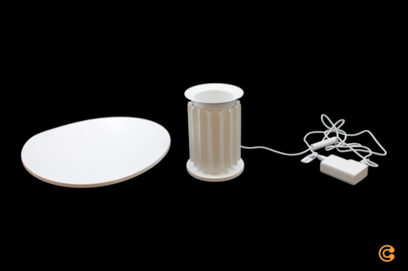 Die Tischleuchte bietet eine indirekte und reflektierende Beleuchtung, sowie einen verstellbaren Glasdiffusor. Die LED Lampe im Sockel der Leuchte strahlt das Licht an die im mundgeblasenem Glaskörper liegende Reflektorplatte, die das Licht daraufhin verteilt. Durch die verstellbare Glasschale kann das Licht in die gewünschte Richtung gelenkt werden. Während die transparente Schale das Licht frei streut, erzeugt die Reflektorplatte aus glänzend weißem Aluminium diffuses Licht. Durch einen Switch-Dimmer am Kabel der Lampe kann die Lichtintensität je nach Belieben reguliert werden und so neben einer hellen Beleuchtung auch eine gemütliche Atmosphäre erzeugen.