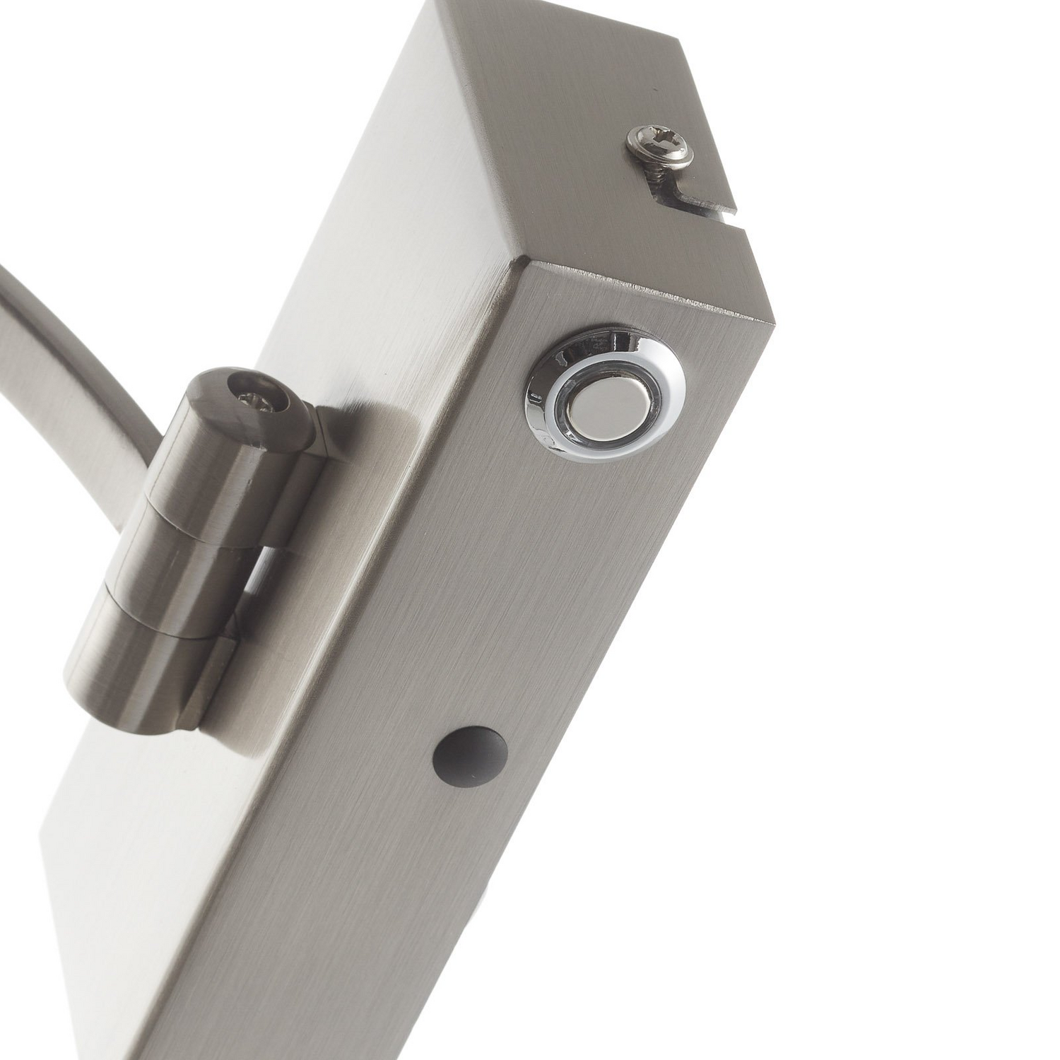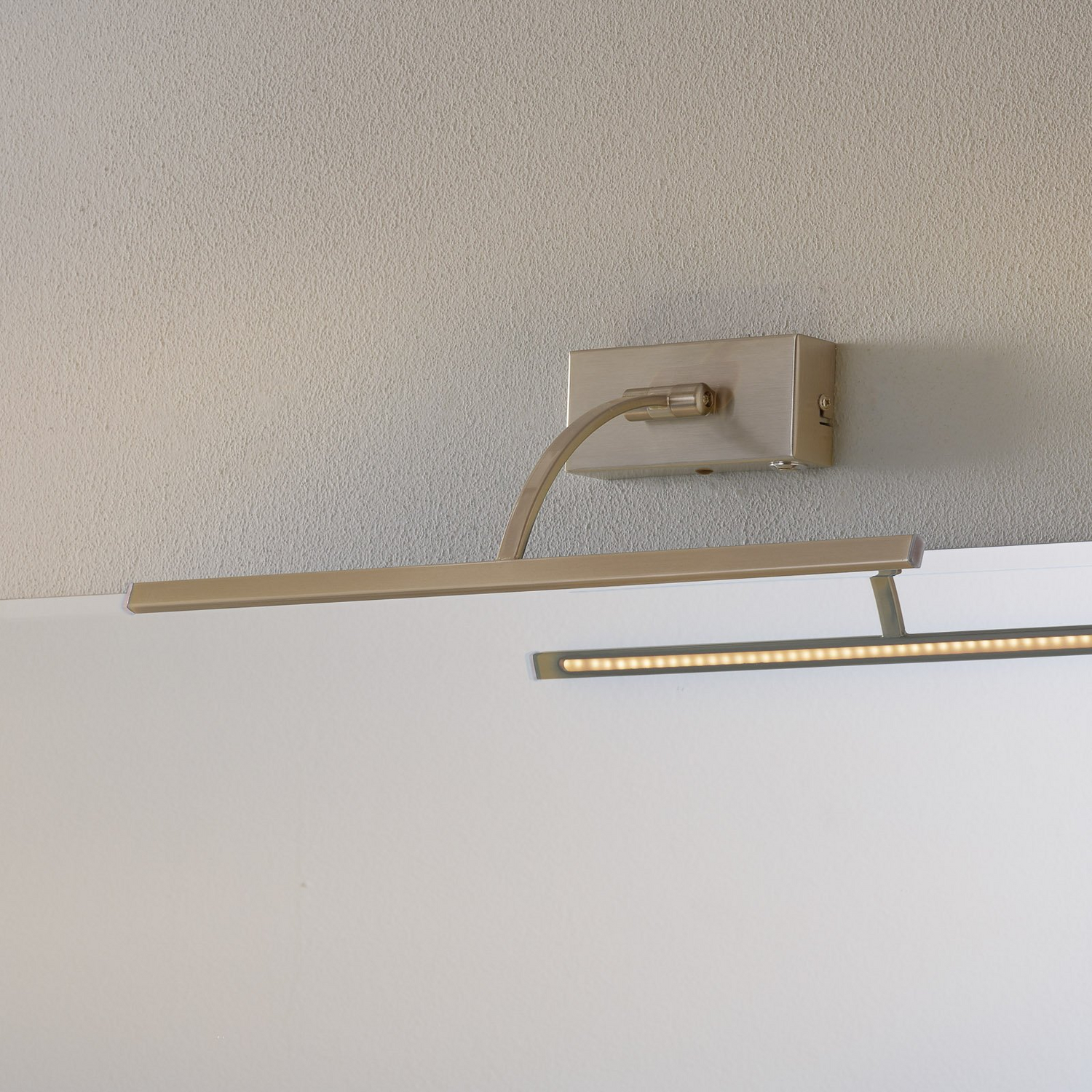 Dimmbare LED-Wandleuchte Matisse mit beweglichem Arm Die moderne und zeitlose LED-Wandleuchte Matisse eignet sich ideal zur Beleuchtung von Gemälden oder Spiegeln. Ihr ausladender Arm, an dem ein länglicher, schmaler Leuchtenkopf befestigt ist, lässt sich nach oben und unten bewegen. Somit ist sie nicht nur in der Höhe leicht beeinflussbar, sondern auch in der Ausrichtung des Lichtstrahls. Das Licht wird über die gesamte Länge direkt abgegeben und erstrahlt in einem warmweißen Ton. An der eckigen Wandhalterung ist ein Schalter integriert. Über diesen kann die Leuchte an- oder ausgeschaltet werden. Außerdem verfügt er über einen Dimmer, der sich dank Memory-Funktion die zuletzt gewählte Einstellung merkt.