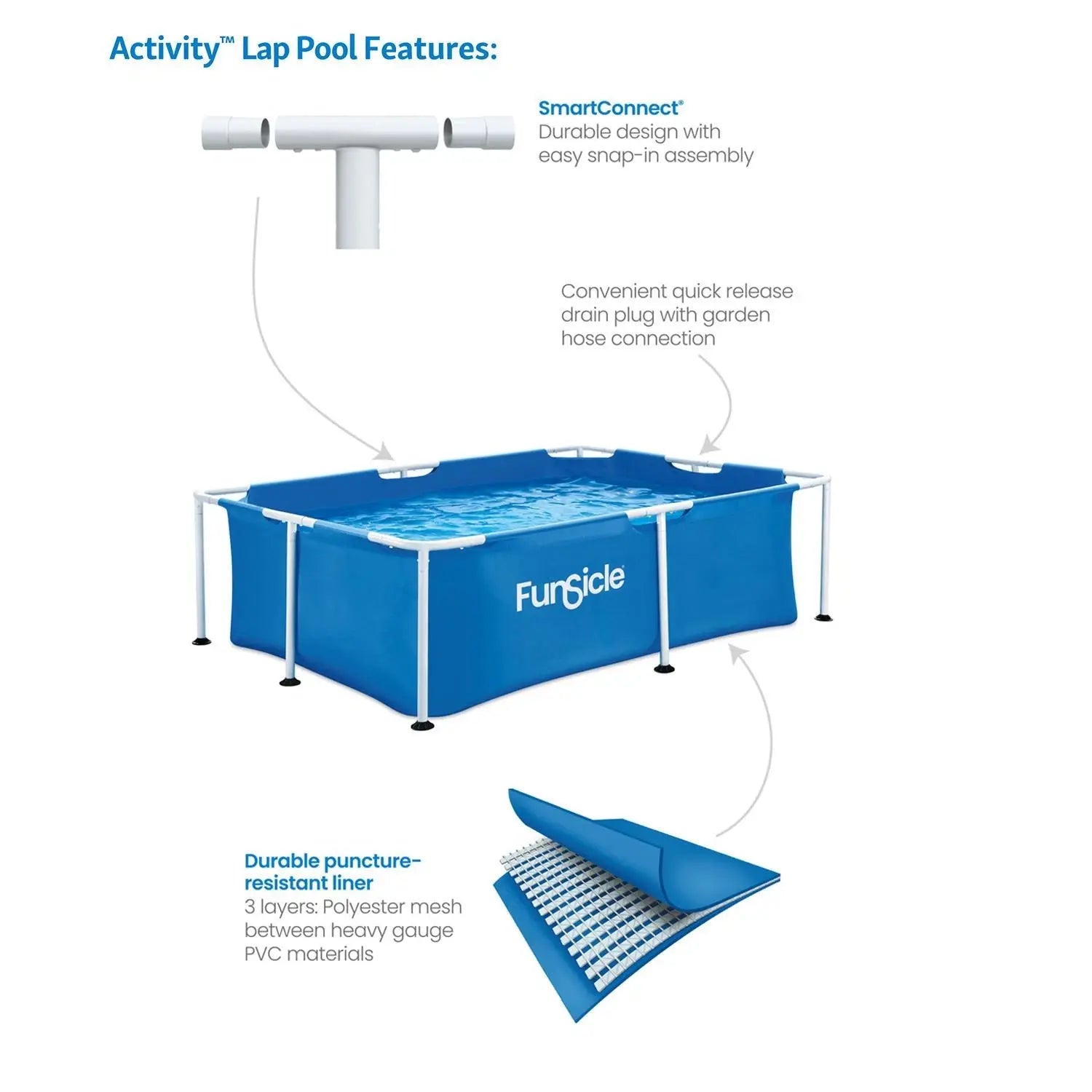 Der kompakte und praktische Funsicle Frame-Pool ist ideal für Kinder und kleine Gärten. Dank seiner rechteckigen Form passt er auch in begrenzte Flächen und bietet trotzdem genügend Platz für Spiel und Abkühlung. Die robuste Konstruktion aus korrosionsbeständigem Stahl sowie die verstärkte 3-lagige PVC-/Polyester-Folie gewähren Stabilität und Langlebigkeit. Mit einem Fassungsvermögen von 1.775 Litern sorgt der Pool für erfrischenden Badespaß im Sommer.