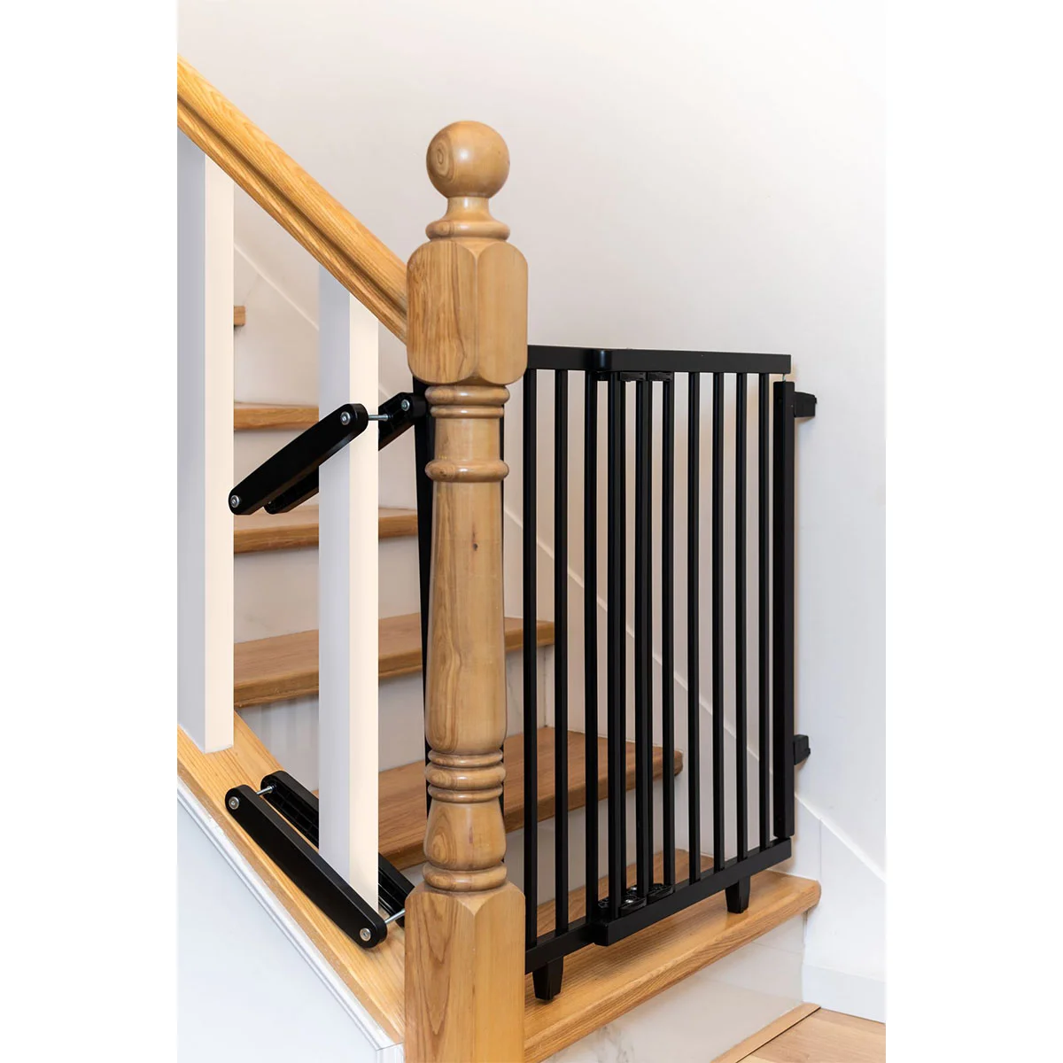 Sichere Öffnung: Das Schwenk-Türschutzgitter lässt sich in beide Richtungen montieren und schließt zuverlässig und sicher. Für Erwachsene ist ein einhändig bedienbarer Öffnungsmechanismus mit einem 2-Aktionen-Sicherheitsverschluss vorgesehen, der sich leicht bedienen lässt. Ein zusätzlicher Anschlag verhindert, dass das Gitter in den Gefahrenbereich öffnet.