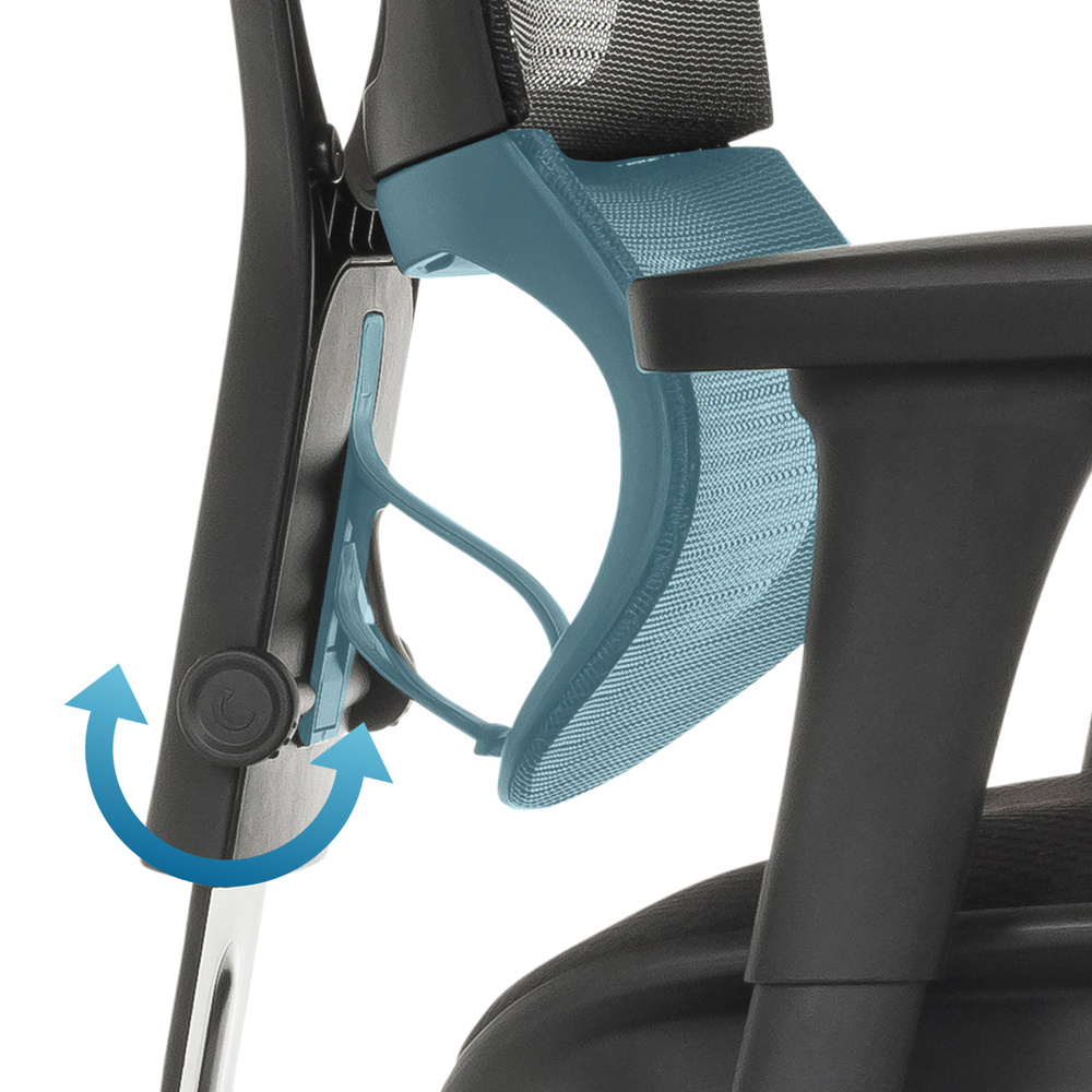 - Flexible Lendenwirbelstütze mit variierbarem, angenehmem Anpressdruck. Position regulierbar über die Höhenverstellung der Rückenlehne