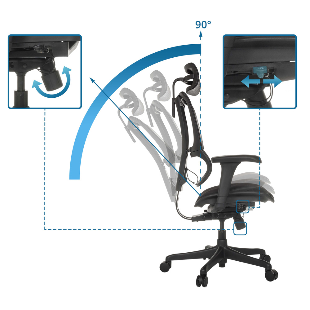 - 3D-Kopfstütze, in Höhe, Neigung und vertikal verstellbar. Höhenverstellung: 60 mm, Neigungsverstellung: 35°, Vertikal: 25 mm