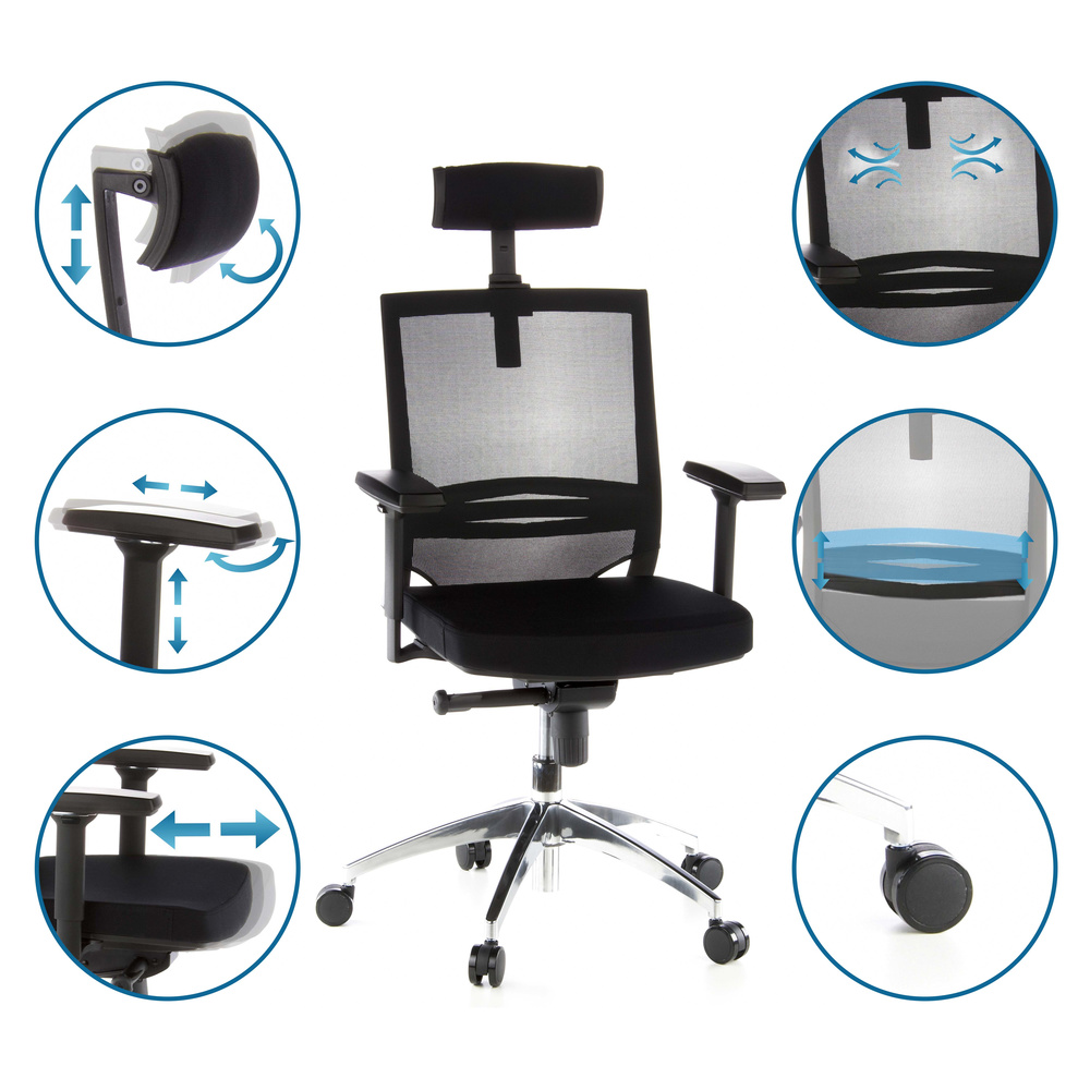 Hochwertig verarbeiteter Profi-Bürostuhl mit einstellbarer Lendenwirbelstütze für höchsten Sitzkomfort. Bezug aus atmungsaktivem Netzstoff. Inklusive höhenverstellbarer Armlehnen und Kopfstütze. Stabiles Aluminium - Designer - Fußkreuz. Durch die höhere Rückenlehne des PORTO MAX ist dieser besonders für Personen bis 1,90 m geeignet.Artikelspezifikationen