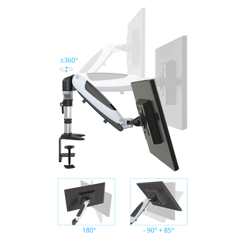 Mit der Monitorhalterung VM-MG2S können Sie Ihren Arbeitsplatz ergonomisch optimal einrichten. Die beiden Bildschirmarme sind dreh-, neig- und schwenkbar und bleiben so auch nach der einfachen Montage an der Tischplatte absolut flexibel. So sind sie jederzeit an Nutzer und Lichtverhältnisse anpassbar. Besonders praktisch: Die platzsparende Konstruktion erlaubt eine Montage auch an Schreibtischen die "Rücken an Rücken" zueinander stehen. Monitore mit VESA Lochmuster lassen sich direkt verbinden. Der perfekte Blickwinkel und eine nackenschonende Haltung sind dank Höhen- und Tiefenverstellbarkeit immer sichergestellt. Die integrierte Kabelführung sorgt außerdem für einen stets aufgeräumten und professionellen Arbeitsplatz.