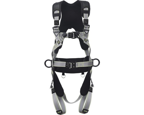 Ausstattung - 2 ideal positionierte textile Auffangösen im Brüstbereich und ein dorsaler Auffangpunkt (D-Ring) für Auffangsysteme sowie 2 seitliche Halteösen (D-Ringe) in Hüfthöhe für Arbeitsplatzpositionierung.