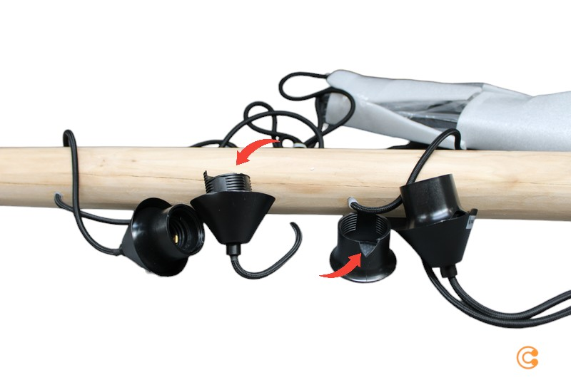 Um den Ast winden sich Seile. Dabei bildet das schwarze Seil einen gelungenen Kontrast zum hellen Holz. Einen weiteren Kontrast bildet das natürliche Holz zu dem filigranen Metallgestell der Schirme. Die vier Abhängungen befinden sich bei Bedarf in unterschiedlichen Höhen, um für ein dynamischeres Gesamtbild zu sorgen.