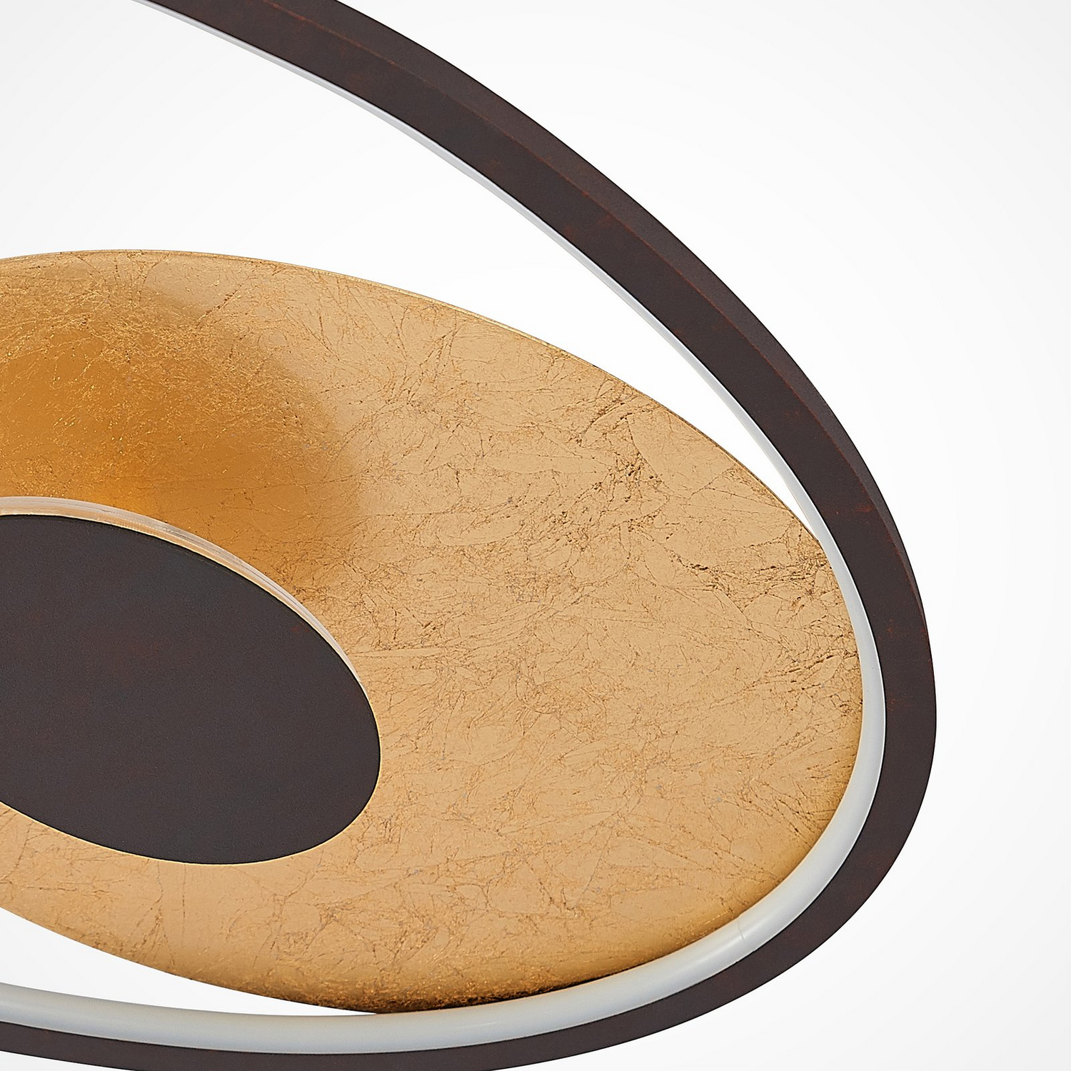 Die LED-Deckenleuchte Feival besteht aus einer runden Deckenplatte, die in Gold gehalten ist. Sie wird von einem rostfarbenem, schmalen Ring in ovaler Form umgeben. Damit erinnert die Leuchte an Planeten wie Saturn oder Jupiter, die ebenfalls von einer Umlaufbahn umgeben sind. Die LEDs sitzen im inneren des Rings und hinter der schwarzen Blende. Sie strahlen dort gegen die goldene Lackierung, sodass der Lichtschein einen goldenen Schimmer verliehen bekommt. Zudem wird das Licht zum Teil nicht direkt in den Raum gegeben. Die indirekte Beleuchtung sorgt für eine angenehm subtile Beleuchtung, die dennoch den ganzen Raum erfüllt. Bei Bedarf kann das Licht über einen Wandschalter gedimmt werden.