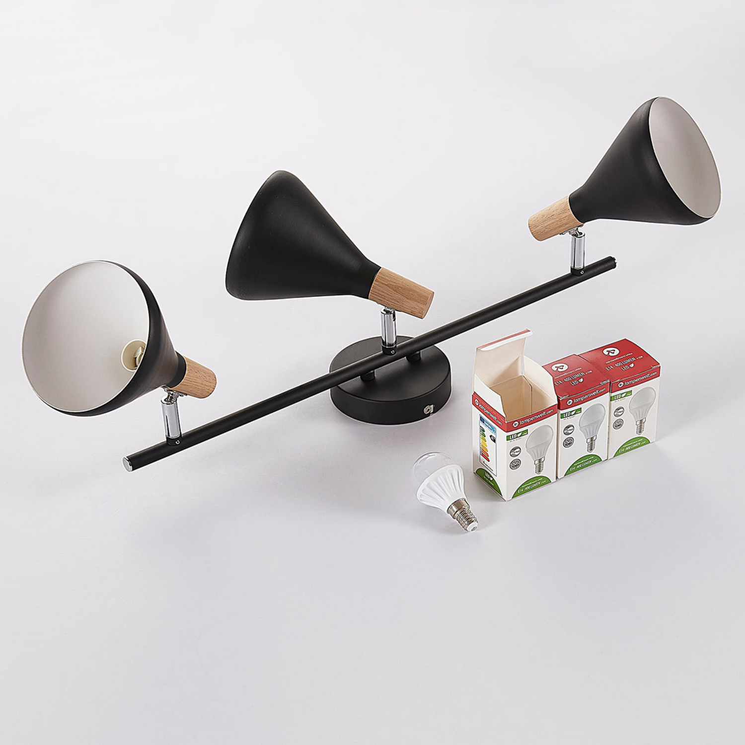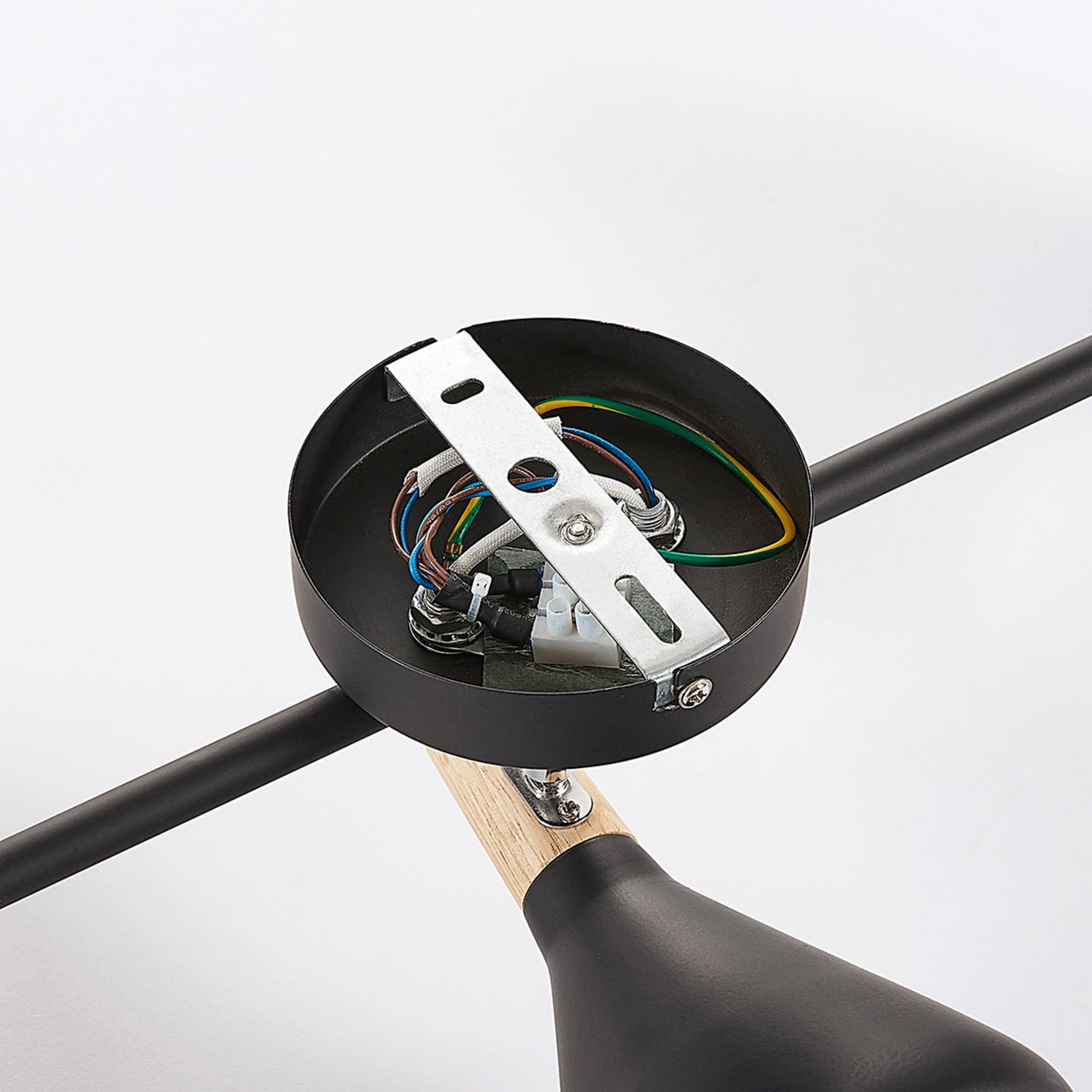 Arina ist eine Deckenleuchte, die den kühlen Ausdruck einer schwarzen Oberfläche mit kleinen Holzdetails verbindet, die eine eher warme Ausstrahlung besitzen. Diese im skandinavischen Stil gehaltene Leuchte besitzt eine besondere Ästhetik und kann in modernen Räumen vielfältig verwendet werden. Die Metallschirme von Arina können beliebig gedreht und geschwenkt werden, weil sie über Gelenke mit dem Leuchtengestell verbunden sind. Die Leuchte wird mit E14-Leuchtmitteln betrieben.