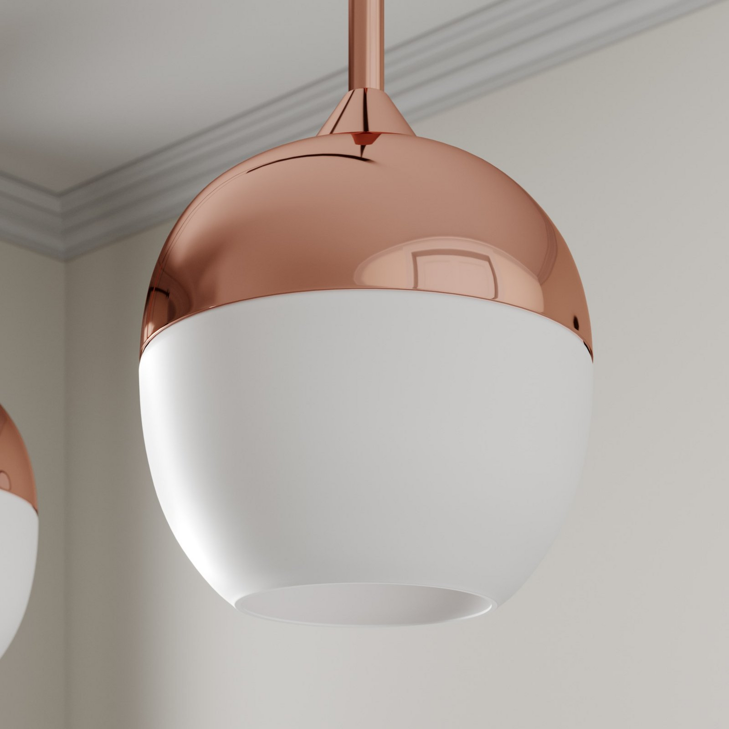 Rangina ist ein sehenswerter Lichtspender für moderne Essbereiche, der sich durch ein edles Kupferfinish auszeichnet. Die kugelförmigen Schirme sind zweigeteilt: Oben glänzen sie kupferfarben und unten geht jeder Schirm in weißes Glas über, was eine sehr weiche Verteilung des Lichtscheins ermöglicht. Dies erzeugt eine gemütliche Lichtwirkung, die über dem Essplatz sehr beliebt ist, da hier oft eine soziale Komponente vorhanden ist, während Familienmitglieder oder Freunde zusammen eine Mahlzeit einnehmen und sich austauschen. Gemütliches Licht am Esstisch trägt dazu bei, dass man sich wohlfühlt und gerne länger verweilt.