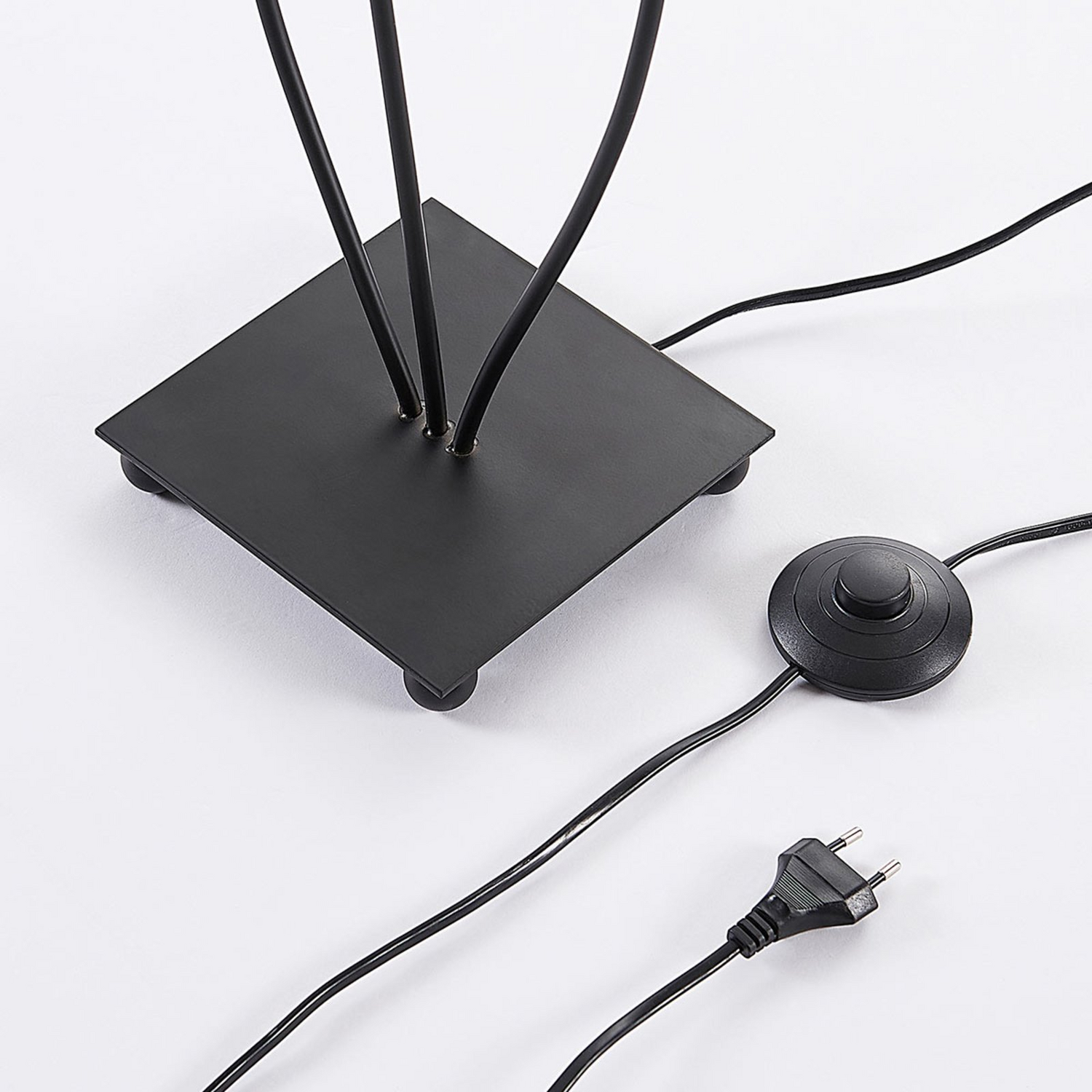 Die Stehleuchte Melis verkörpert ein verspieltes Erscheinungsbild, das vor allem durch die gebogenen, miteinander verschlungenen Streben entsteht, die jeweils zu einem Leuchtenschirm führen. Die Stoffschirme verjüngen sich nach oben und sind in den Farben Braun, Grau und Creme gehalten, was für einen warmen und weichen Lichtschein sorgt, der eine gemütliche Stimmung verbreitet. Das schwarze Leuchtengestell rundet das Design ab.