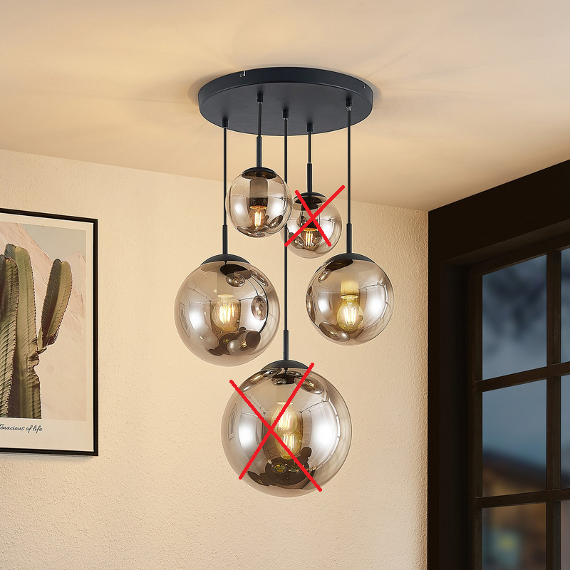 Diese Hängeleuchte sorgt im Wohnbereich für das gewisse Etwas und ist ein sehenswerter Lichtspender mit fünf Glasschirmen in Kugelform. Die fünf Rauchglaskugeln sind zum Teil in unterschiedlicher Größe gestaltet und hängen zudem auf unterschiedlicher Höhe von der Decke herab, so dass das Erscheinungsbild von einer gewissen Dynamik und Abwechslungsreichtum geprägt ist. Das Lichtbild wirkt angenehm und wohnlich, wobei man die Leuchtmittel hinter dem Glas gut erkennen kann, so dass sie präsenten Einfluss auf das Gesamterscheinungsbild nehmen und dementsprechend ausgewählt werden sollten. LED-Filamentlampen sind hierbei sehr passend, zumal sie mit der LED-Technik als energiesparend gelten. In der fünfflammigen Ausführung kann die Pendellampe für eine gute Helligkeit im Wohnbereich sorgen.