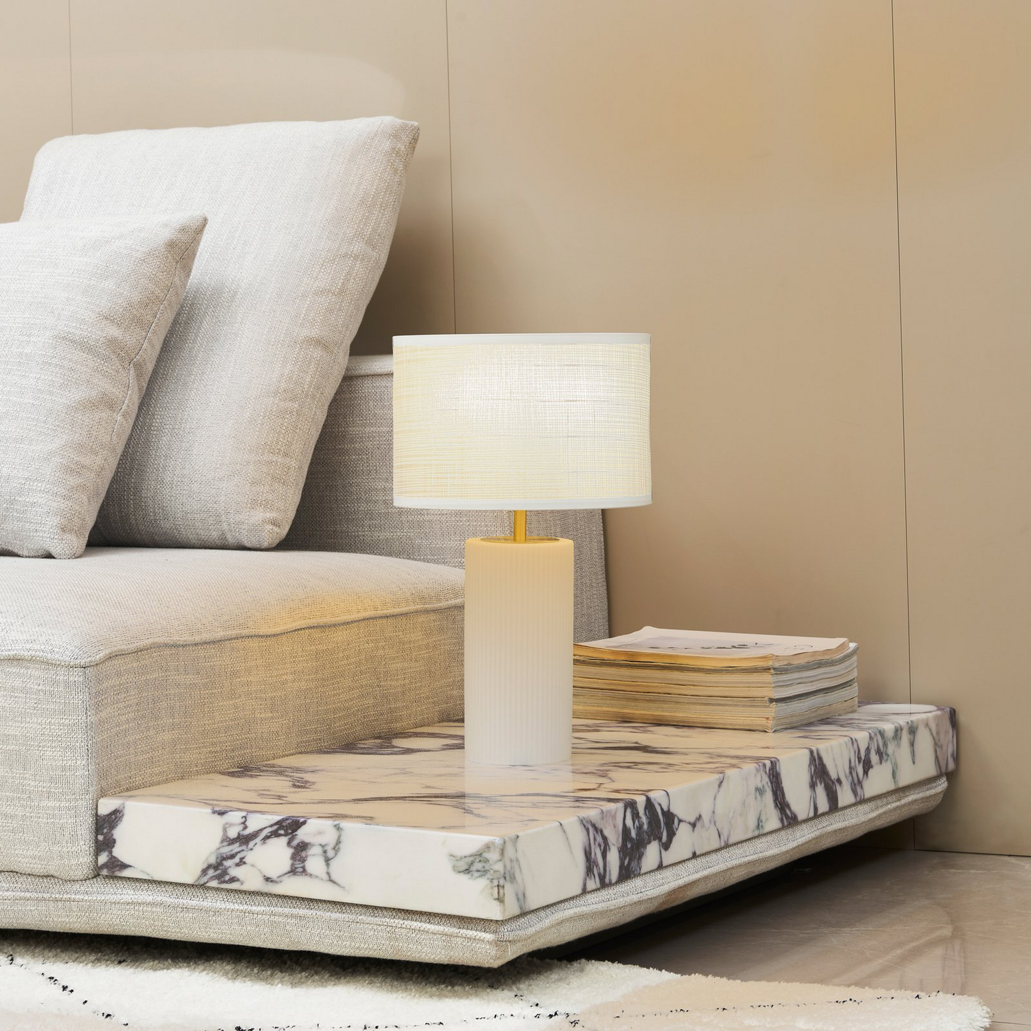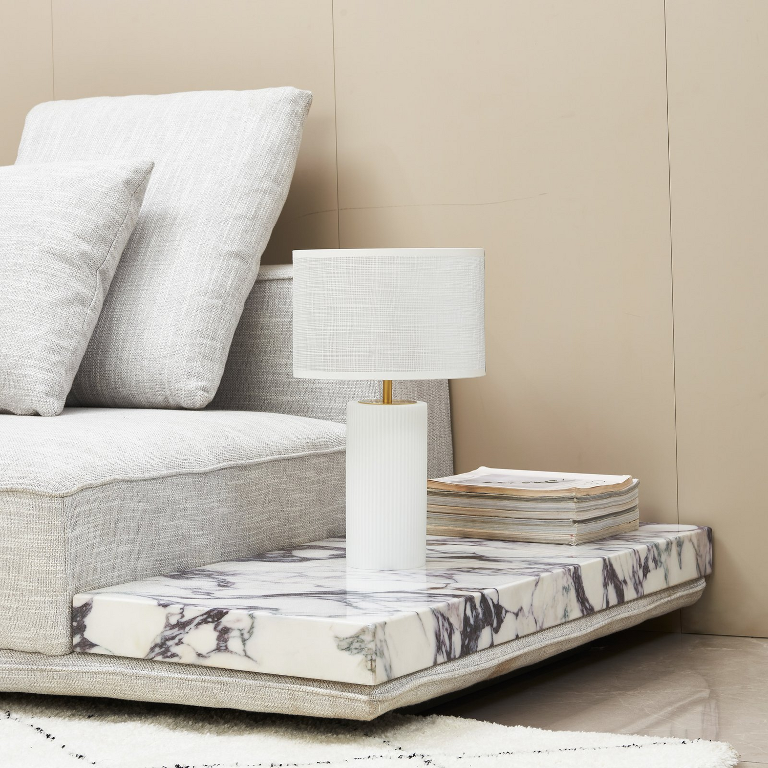 Weiße Tischleuchte Sorscha aus Glas und Eisen