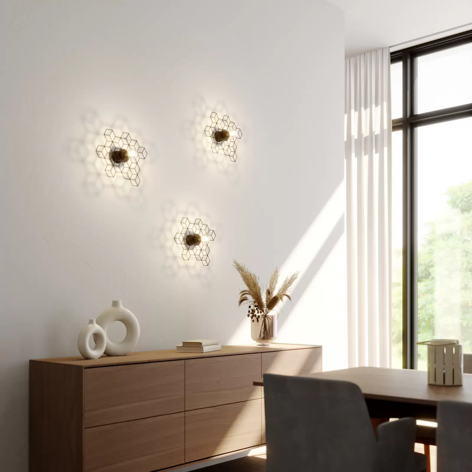 Bei der Wandlampe Alexaru handelt es sich um ein edles Leuchtendesign mit Objektcharakter, das in Wohnräumen außerordentlich gut zur Geltung kommt, aber auch in gewerblichen Umgebungen wie zum Beispiel im Umfeld von Hotellerie und Gastronomie sehr exquisit aussieht und dem Raum ein individuelles und luxuriöses Flair verleiht. Die spannende Wabenoptik - wenn man genau hinsieht, dann kann man in den Waben auch Rauten erkennen - entspricht einem angesagten Trend und sorgt zudem für ein edles Lichtspiel an der Wand, wo sich die Struktur der Leuchte nochmal in einem Spiel aus Licht und Schatten abbildet. Ohne Frage entsteht auf diese Weise eine besondere Ausstrahlung mit Designcharakter, die sicher nahezu jeden begeistert. Midcentury meets Loft!
