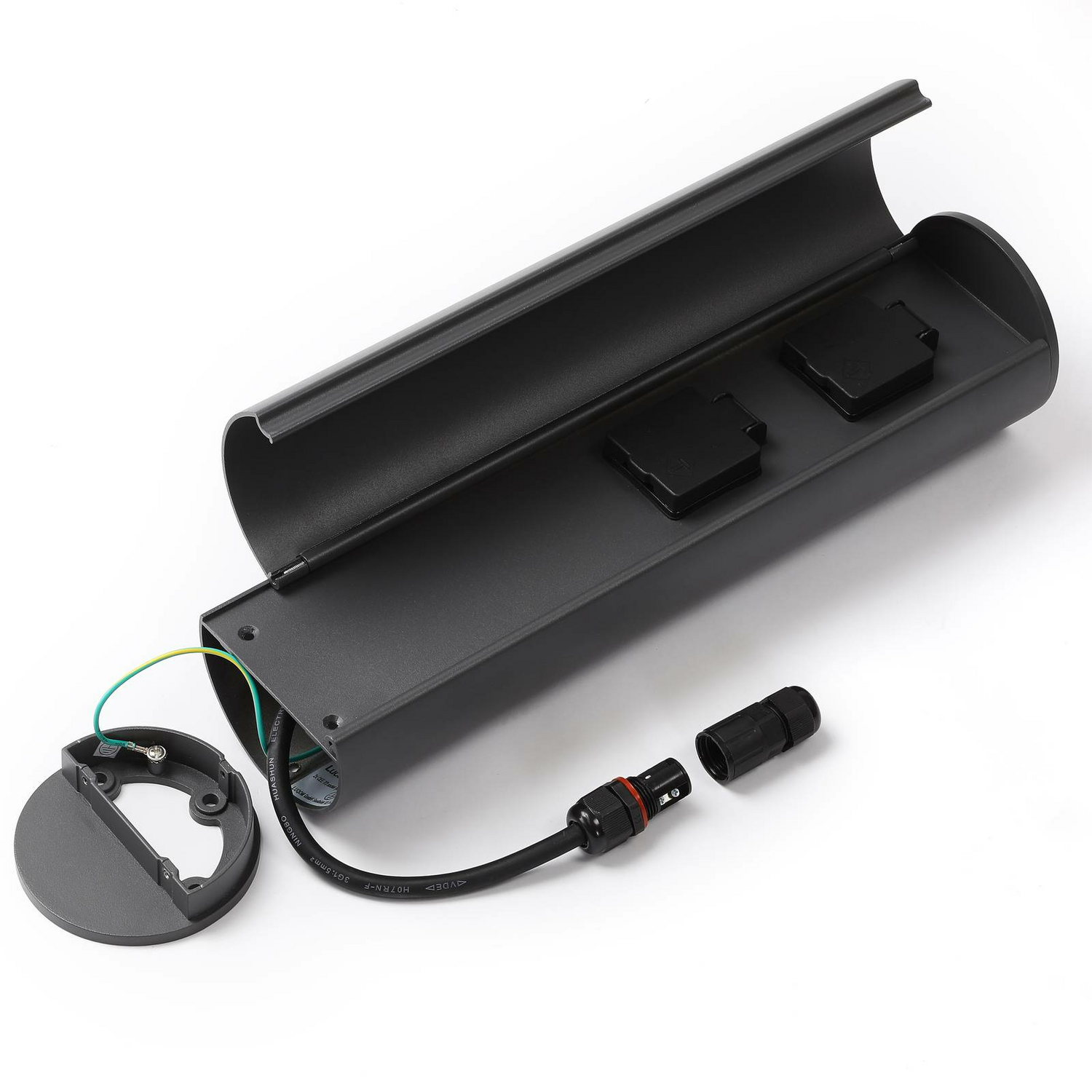 Die Steckdosensäule Corban ist aus Aluminium gefertigt und verfügt über zwei Steckplätze. Die Säule ist für maximal 3680 Watt ausgelegt und wurde zusätzlich mit einer Abdeckung versehen.