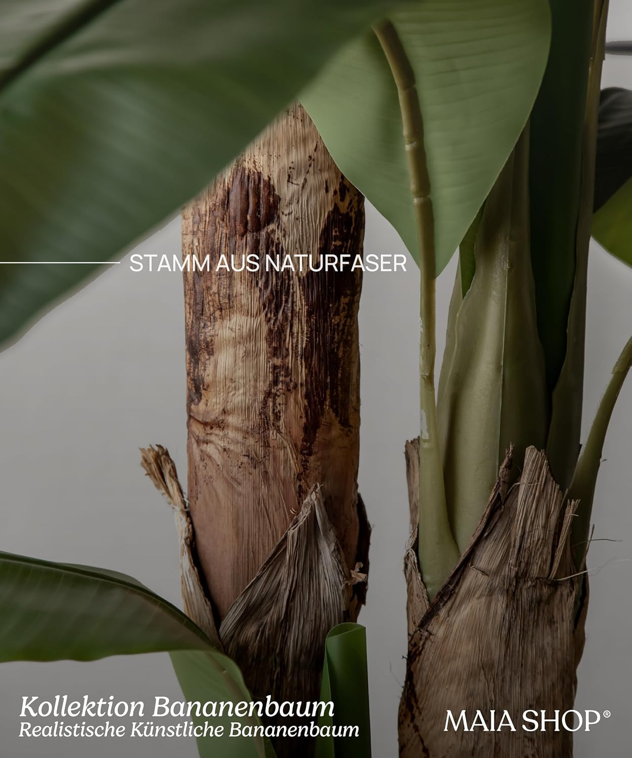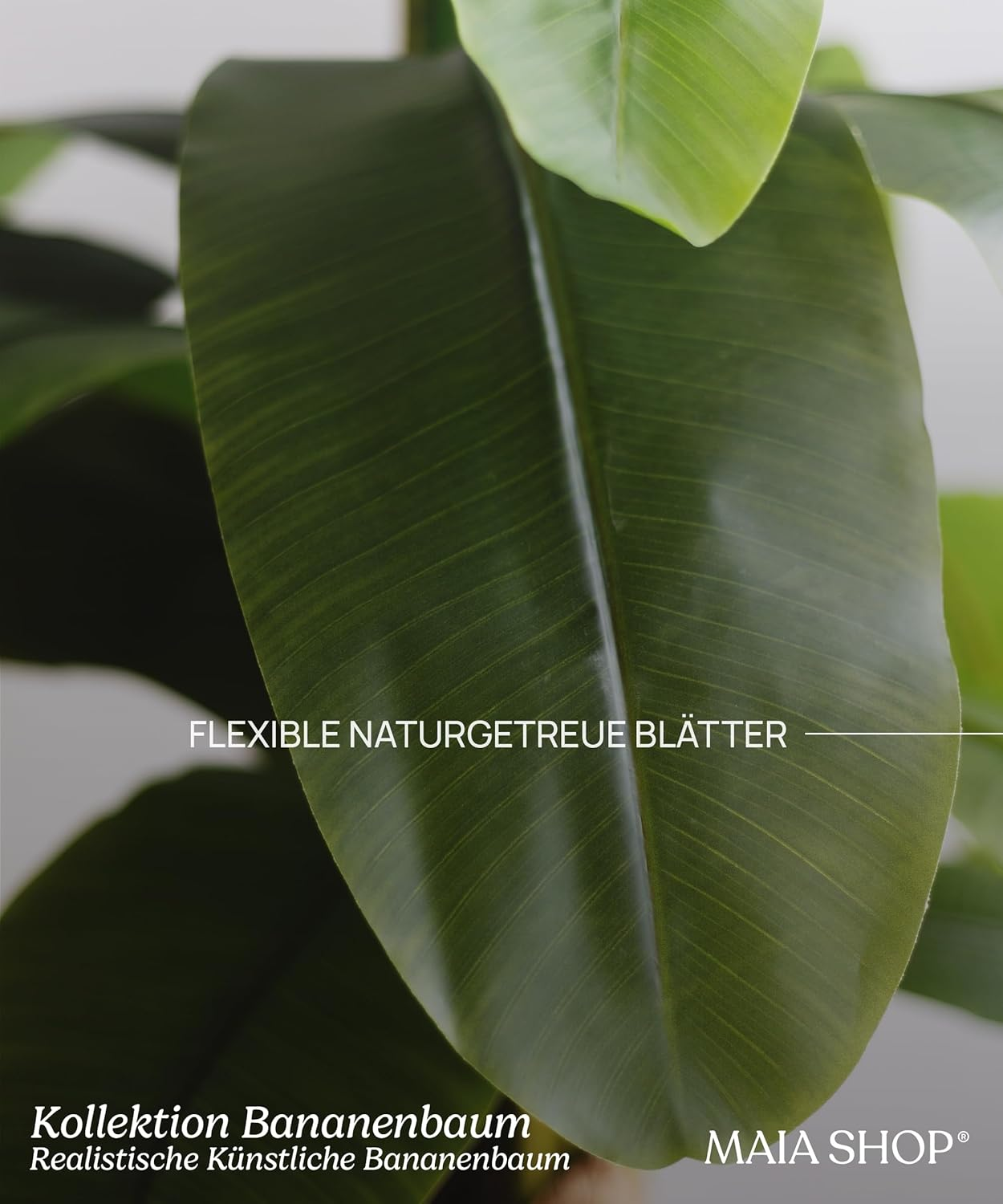 - REALISTISCHE KÜNSTLICHE PFLANZE: Lass dich von der künstlichen Bananenpflanze von Maia Shop überraschen, die einen Stamm aus Naturholz hat und dadurch ein hyperrealistisches Aussehen erhält. Verleih deinen Räumen mit unserer handgefertigten dekorativen Kunstpflanze aus Spanien einen Hauch von Authentizität und Natur. Diese Pflanze ist perfekt, um jedem Raum Leben einzuhauchen. Maße der Pflanze: 150 cm hoch x 80 cm breit.