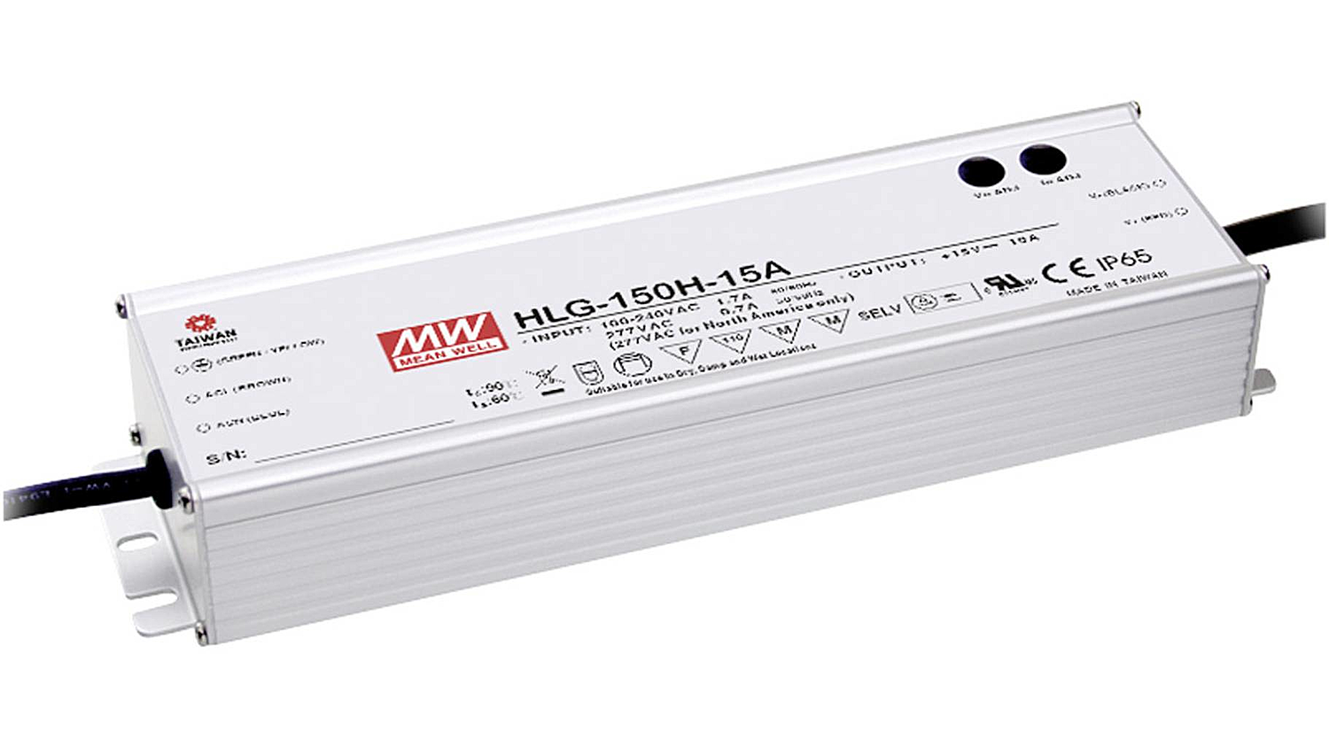 LED-Netzteil im Metallgehäuse mit einem Eingangsspannungsbereich von 90~305VAC. Mixed Mode Ausgang (spannungsstabilisiert bis Maximalstrom mit nachfolgender Stromstabilsierung, C.V.+C.C), Schutzklasse IP65