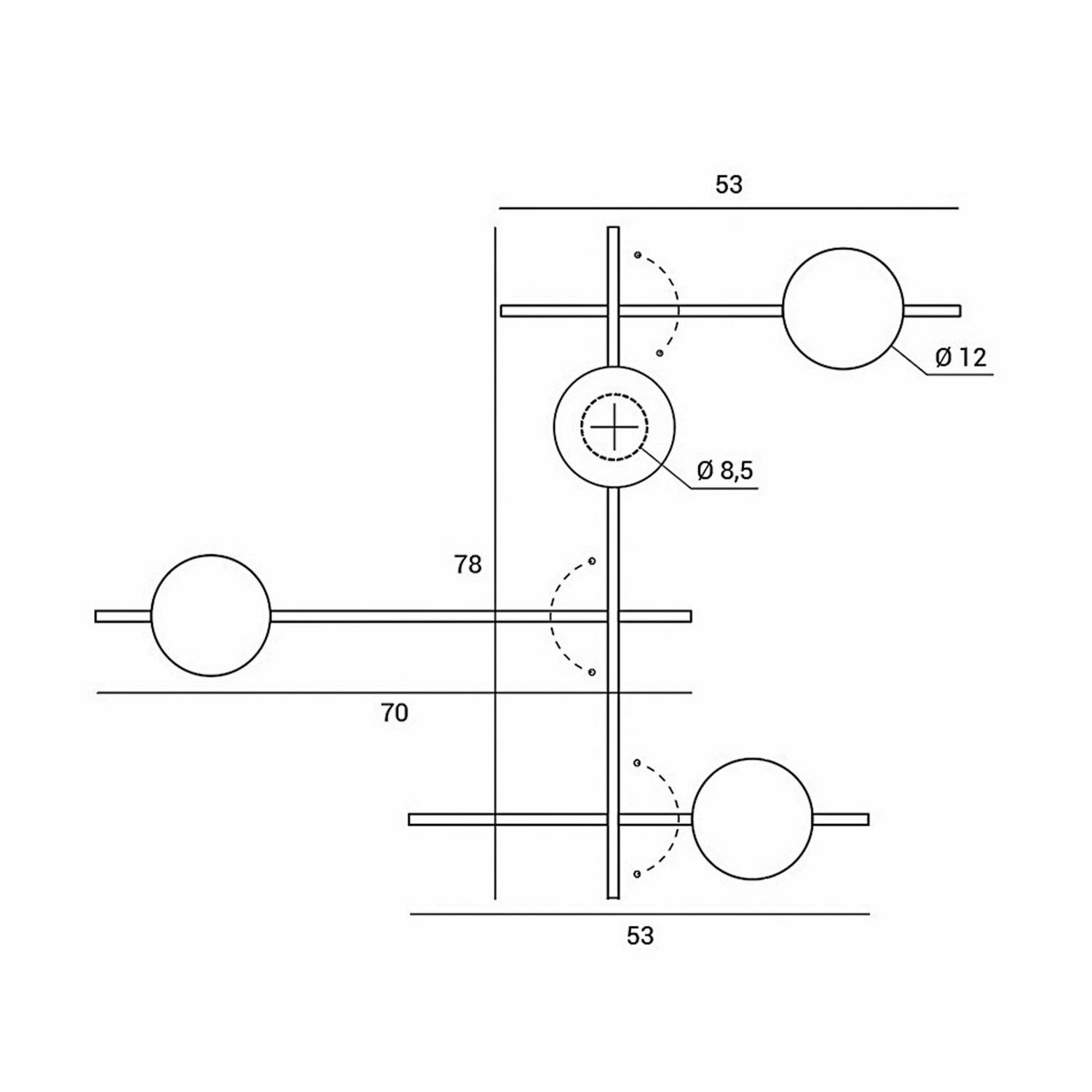 Ø Schirm 12 cm; Ø Wandanschluss 8,5 cm; Stablängen - 78 cm / 53 cm / 53 cm / 70 cm