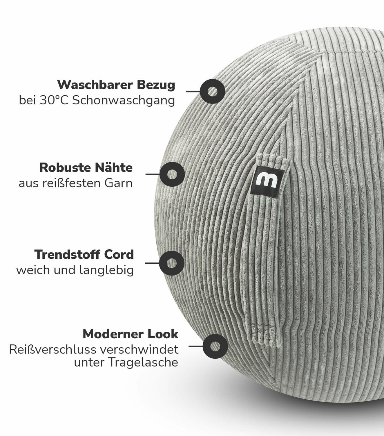 Stoffbezug aus Cord (100% Polyester), Webstoff (100% Polyester) oder in Wildlederoptik aus Recyclingstoff (100 % recyceltes PES). Innenball aus PVC mit Anti-Burst-Technologie und ohne schädliche Weichmacher.