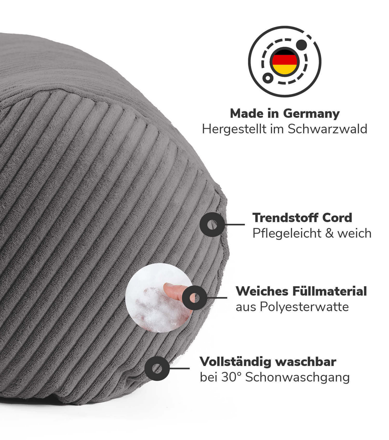 - MADE IN GERMANY! Die ultraleichte Kissenrolle mit Füllung aus hochwertiger Polyesterwatter und einem Bezug aus weichem Cordstoff wird lokal im Schwarzwald hergestellt. Achtung: Kein Stützkissen.