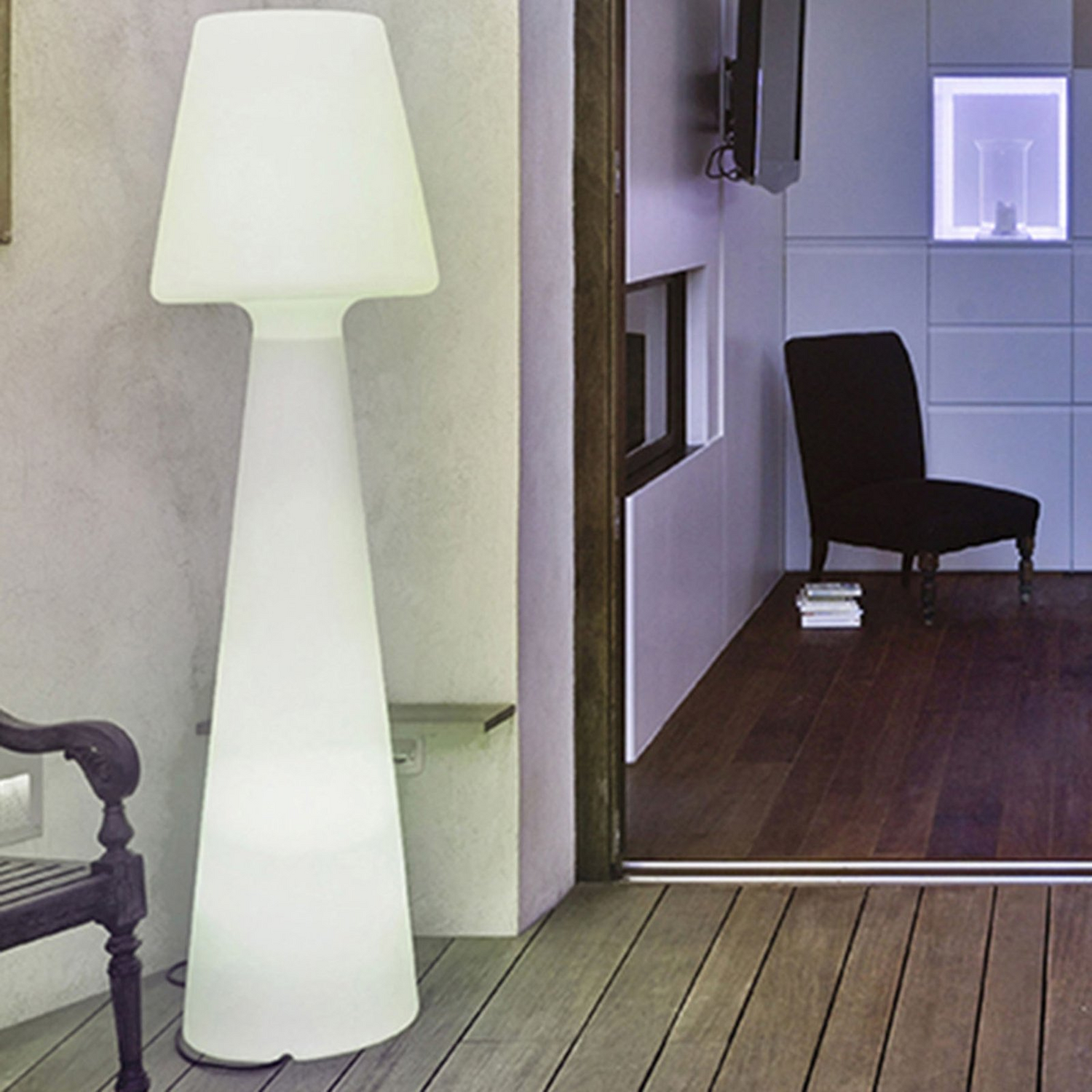 Stehleuchte Lola für den Innen- und Außenbereich aus Kunststoff Die Stehleuchte Lola gilt als Ikone der Produktfamilie der spanischen Marke Newgarden. Sie besticht durch eine besondere Form und ist ein Bestseller der Marke Newgarden. Die gesamte Leuchte besteht aus Polyethylen, einem äußerst widerstandsfähigen Kunststoff, der sowohl extremen Temperaturen trotzt als auch uv-beständig ist, so dass eine lange Lebensdauer gewährleistet wird. Ein 4 Meter langes Kabel mit Stecker ermöglicht einen großen Aktionsradius, beispielsweise auf der Terrasse. Die Stehleuchte Lola wird mit einer G13 LED-Röhre geliefert, deren Licht den gesamten, weißen Leuchtenkorpus in Szene setzt. Durch das Material hindurch wird eine sehr gleichmäßige Lichtabstrahlung gewährleistet. Ob im privaten Bereich, im repräsentativen gewerblichen Umfeld oder in der Gastronomie - die Stehleuchte Lola wird überall zu einem leuchtenden, Blicke auf sich ziehenden Dekorationsobjekt.