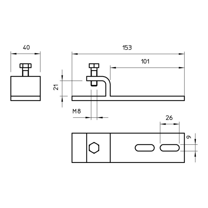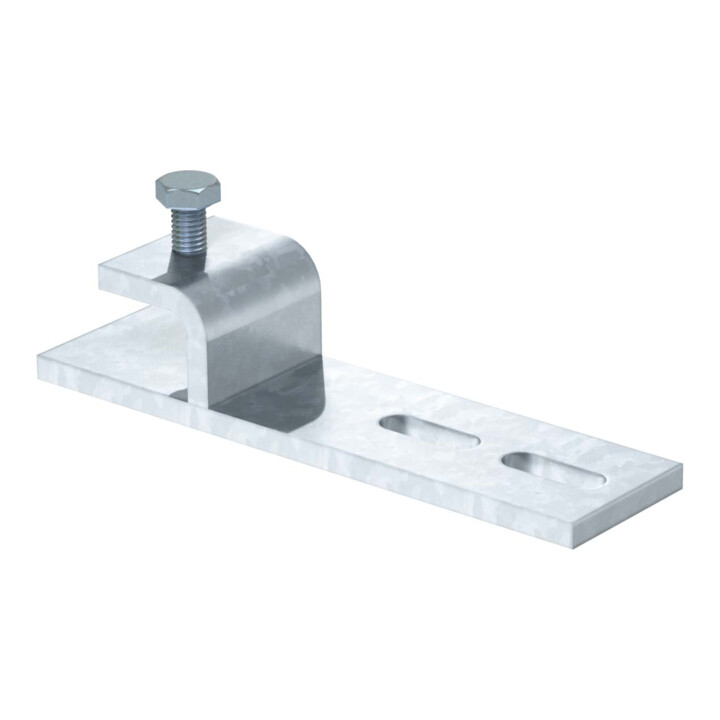 Befestigungsklemmstück für den waagerechten Trassenverlauf, zur schraubenlose Befestigung an Stahlträgern und zur Aufnahme von Kabelrinnen und Gitterrinnen.