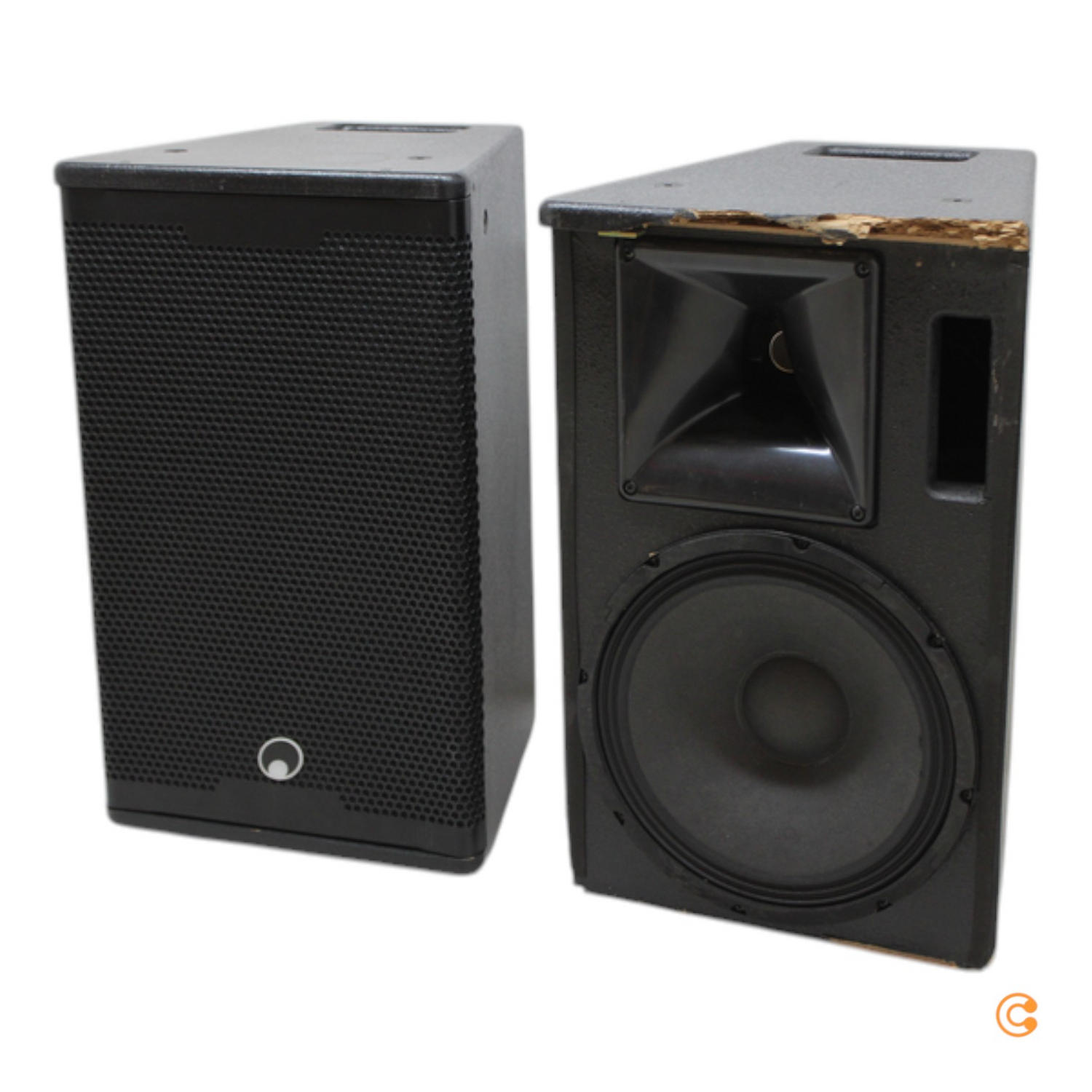 Hinweis: Optischer Zustand: einer der Lautsprecher hat eine beschädigte Basis und Oberkante - siehe Fotos. Im Lieferumfang fehlt: Lautsprecherkabel, Netzkabel, 1x Frontlautsprecherabdeckung.