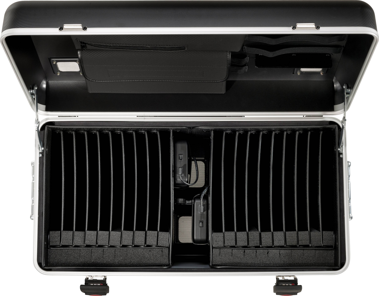 Die Einschubfächer sind aus ebenso leichtem wie formstabilen Kunststoffwaben gefertigt - und dank der in Deckel und Boden angebrachten Öffnungen kann die Luft im Innenraum bestmöglich zirkulieren. Mit dem Zahlenschloss und seiner schlagzähen, gummierten Außenschale aus 3 mm starkem X-ABS-Kunststoff zeichnet sich der Systemkoffer darüber hinaus durch einen sicheren Rundumschutz aus. Vier kugelgelagerte Leichtlaufräder, der 4-fach Trolley-Teleskopauszug und zwei Tragegriffe sorgen für spürbar hohen Transportkomfort. Zudem gewinnt das Case i20 durch den umlaufenden Aluminiumrahmen an Deckel und Korpus an Stabilität und Passgenauigkeit beim Öffnen und Schließen.