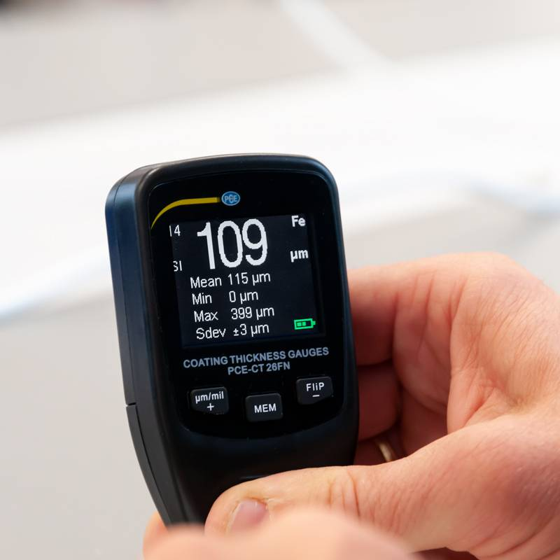 Das Schichtdickenmessgerät PCE-CT 26FN kann zerstörungsfrei Beschichtungen (Lacke, Farben, Kunststoffe ...) auf Stahl / Eisen und Nichteisenmetallen messen. Es ist bestens geeignet, um Unfallschäden an KFZ sofort zu erkennen. Auch im industriellen Bereich wird es zur Warenein- und Ausgangskontrolle benutzt, um gleichbleibende Produktqualitäten zu gewährleisten. Das ergonomische Design mit integrierter Messsonde ermöglicht schnelle und präzise Messergebnisse. Es ist für Messungen von nicht magnetischen Schichten wie Lack, Kunststoff, Chrom, Kupfer, Zink, Emaille auf Stahl und Eisen sowie isolierende Schichten wie Lack, Kunststoff, Emaille, Papier, Glas, Gummi auf Kupfer, Aluminium, Messing, Edelstahl und Aluminium konstruiert.