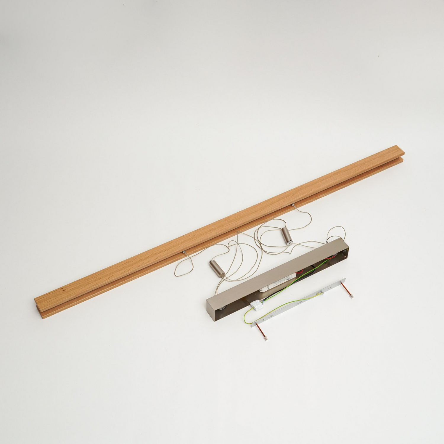 Höhenverstellbare Holz-LED-Pendellampe Alin mit nach oben und unten gerichtetem Licht, beste Qualität made in Germany Zwei massive Echtholzelemente aus Eiche, die sich seitlich an ein LED-Leuchtelement fügen, bilden den Rahmen bzw. den Schirm der LED-Pendelleuchte Alin und verbreiten ein natürliches Flair im Raum. Weil der Lichtschein sowohl nach oben als auch nach unten gerichtet ist, hat die höhenverstellbare LED-Pendellampe eine integrierte Up- und Down-Beleuchtung und bietet so ein angenehmes, natürlich erscheinendes Ganzraumlicht. Mit der länglichen Form eignet sich Alin hervorragend für die Nutzung über einem Tisch, sei es nun im Esszimmer oder über dem Arbeitsbereich. Die integrierten, warmweiß leuchtenden LEDs bieten eine sehr effiziente Beleuchtung, die mit einer hohen Grundhelligkeit punktet. Bei Bedarf kann man einen externen Dimmer installieren bzw. den vorhandenen nutzen und somit die Leuchtkraft durch stufenlose Variation optimal an die eigenen Bedürfnisse anpassen. Die Höhe der Abhängung lässt sich - ein ebenso bedienerfreundliches Feature - mit nur wenigen Handgriffen im Bereich von 105 cm bis 195 cm anpassen, da ein Seilzugmechanismus integriert ist. Die hochwertige Holzoberfläche ist in aufwendiger Handarbeit bearbeitet und veredelt worden und der 2-Materialien-Look aus Eichenholz und nickelfarbenem Metall wirkt ebenso kontrastreich wie harmonisch und eignet sich durch die geradlinige Ausgestaltung der LED-Pendellampe hervorragend für die Ergänzung moderner Räumlichkeiten, die von einer puristischen Ausstrahlung dominiert werden. - dimmbar mit Phasenan- oder -abschnittdimmer - flickerfrei - sehr gute Farbwiedergabe: CRI > 90 - in Deutschland gefertigt