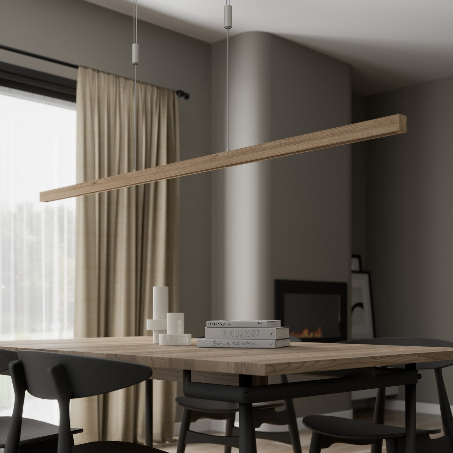 Dimmbare LED-Balkenpendellampe Nora aus hochwertigem Eichenholz - CRI > 90 Holz ist ein Material, das sich mit zahlreichen Stilrichtungen kombinieren lässt, in kaum einer Umgebung fehl am Platz wirkt und für einen natürlichen Touch im Wohnraum sorgt. Der Trend des skandinavischen Designs greift natürliche Farben und Materialien auf und rückt Holz als ein zentralen Bestandteil in den Mittelpunkt. Die LED-Balkenpendellampe Nora wurde aus massivem Eichenholz gefertigt und folgt damit dem Wohntrend des skandinavischen Stils. Der längliche Lichtkörper der Pendellampe benötigt keinerlei Schnörkel oder aufwändige Details, um zum Mittelpunkt des Esszimmers zu werden. Als schlichter, geradliniger Holzbalken mit integrierter LED-Beleuchtung verfehlt Nora keineswegs ihre Wirkung. Der Leuchtenkörper ist aus massivem Eichenholz gefertigt und wurde in Handarbeit in Form gebracht. In die Unterseite des Balkens ist ein Aluminiumrohr eingelassen, das die LEDs beherbergt. Um bei einfallendem Licht eine gelungene Tiefenwirkung zu erzielen, wurde in das Holz im Bereich des Lichtauslasses eine schräge Fase eingearbeitet. Für Unempfindlichkeit gegenüber Berührungen sorgt ein spezielles Matt-Lack-Finish, das dem Holz gleichzeitig den typischen Look von natürlichem, geöltem Echtholz schenkt. Ein ausgeklügeltes Seilzugsystem gewährleistet die stufenlose Höhenverstellbarkeit der Pendellampe. So kann Nora zwischen einer Mindesthöhe von 105 und einer Maximalhöhe von 195 cm auf jede beliebige Höhe abgehängt werden. Wenn gewünscht, sind die integrierten LEDs mittels Phasenan- oder -abschnittdimmer in der Helligkeit regulierbar. Von rustikalen über klassischen bis hin zu modernen Einrichtungsstilen - diese in Deutschland hergestellte LED-Pendellampe wertet jede Umgebung mit ihrem natürlichen, stilvollen Design auf.