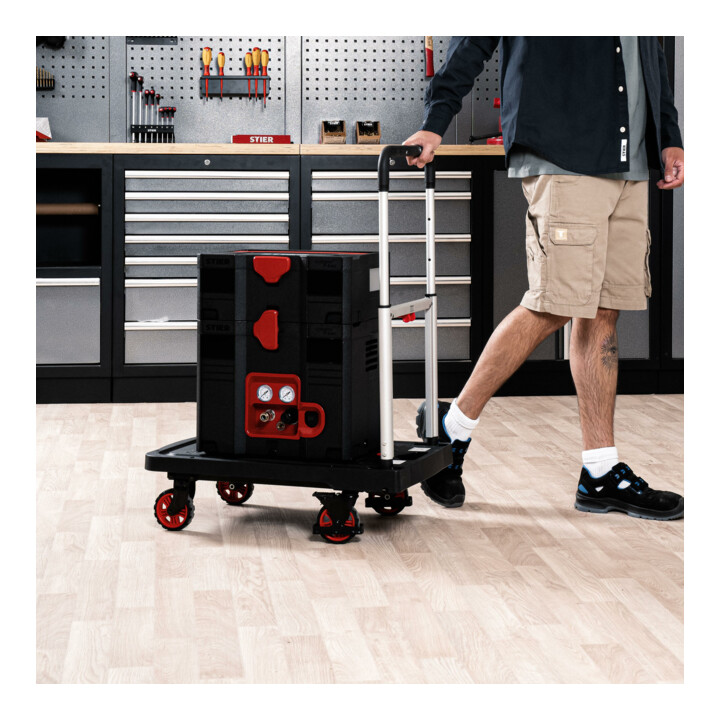 Der STIER Plattformwagen eignet sich optimal für den Transport von leichten Lasten in Büro, Werkstatt oder Lager. Die Rollen und der Schiebebügel sind vollständig klappbar und ermöglichen eine einfache, platzsparende Lagerung. Die Ladefläche besteht aus robustem Kunststoff mit einer geriffelten Oberfläche für besseren Halt der transportierten Waren. Zwei Lenk- und zwei Bockrollen sorgen für einfaches Manövrieren, während der höhenverstellbare Schiebebügel sich individuell anpassen lässt. Ausgestattet mit Gummirollen mit Kugellager ist der Wagen ideal zum Transport von kleinen bis mittelgroßen Objekten in verschiedenen Umgebungen. Die maximale Traglast beträgt 137 kg. STIER-Produkte überzeugen durch Leistungsstärke, Ergonomie und Langlebigkeit.