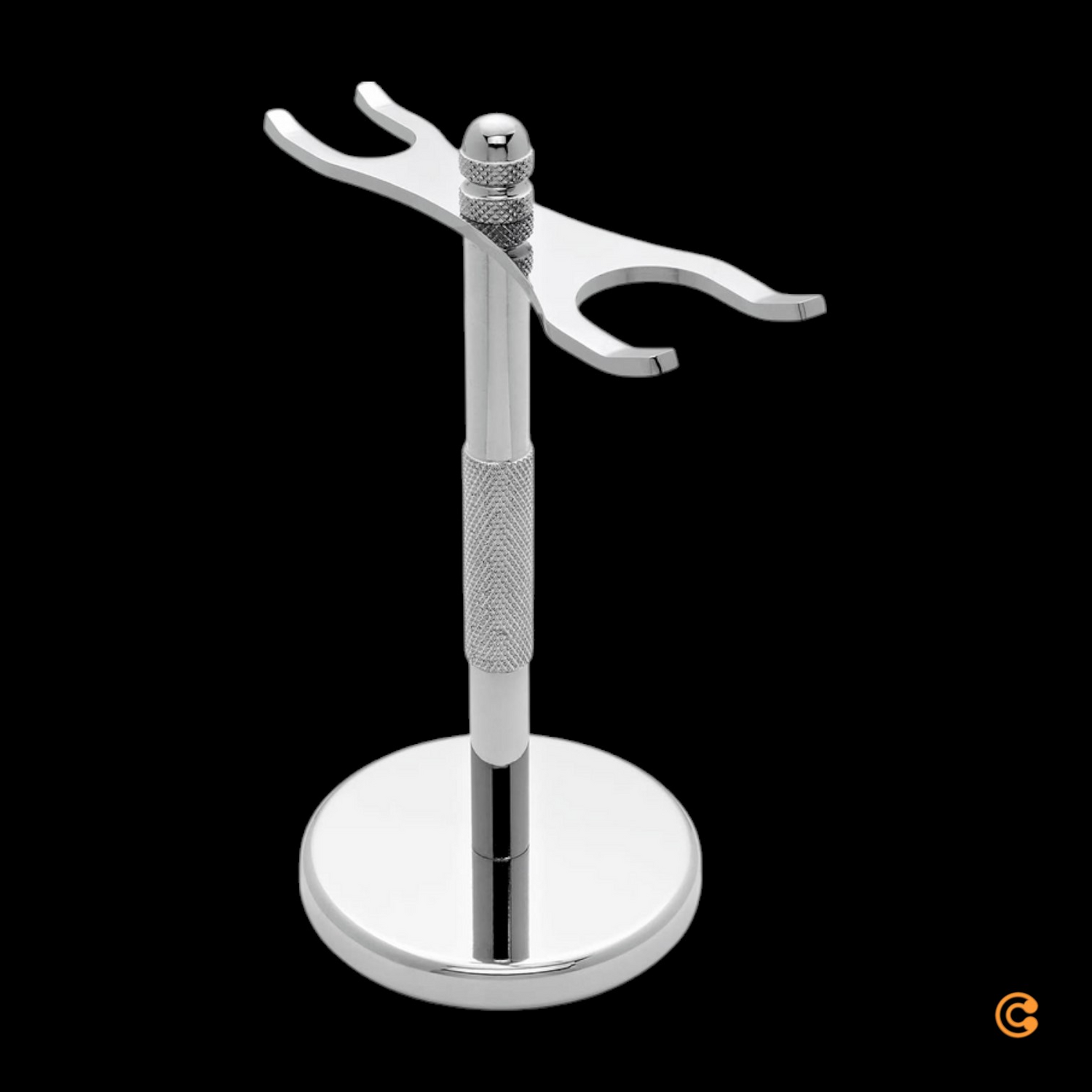Stylisch & funktional: Gefertigt aus massivem Edelstahl, besticht der Ständer durch sein stilvolles Design und seine Langlebigkeit. Er bietet eine stabile und sichere Halterung für Ihre Rasur-Utensilien und fügt sich elegant in jedes Badezimmer ein.