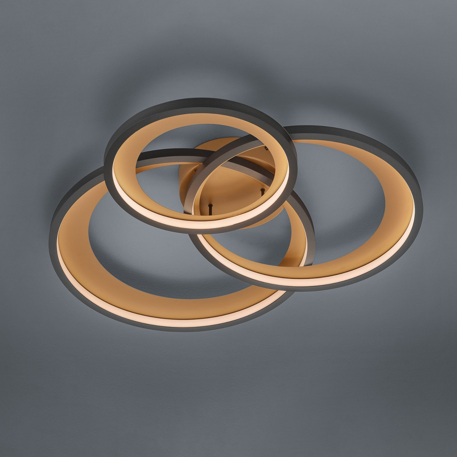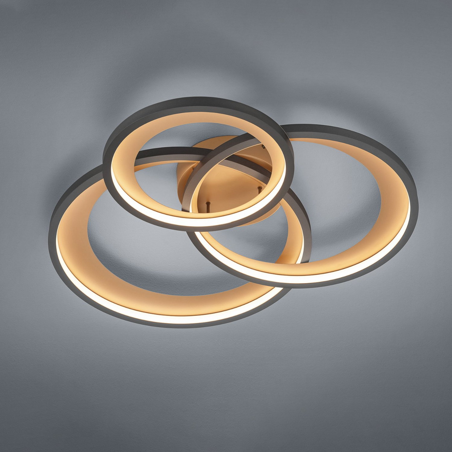 Die Deckenlampe Granada dient nicht nur als attraktiver Lichtspender, sondern ist auch bei Tage ein echter Hingucker. Die Leuchte besteht aus drei Ringen in unterschiedlichen Größen, die sich optisch überlagern. Durch ihre Gestaltung und die besondere Farbgebung eignet sich die Leuchte vor allem für modern eingerichtete Innenräume und wertet beispielsweise den Flurbereich, das Schlafzimmer oder das Wohn- und Esszimmer durch ihr auffallendes Design auf.